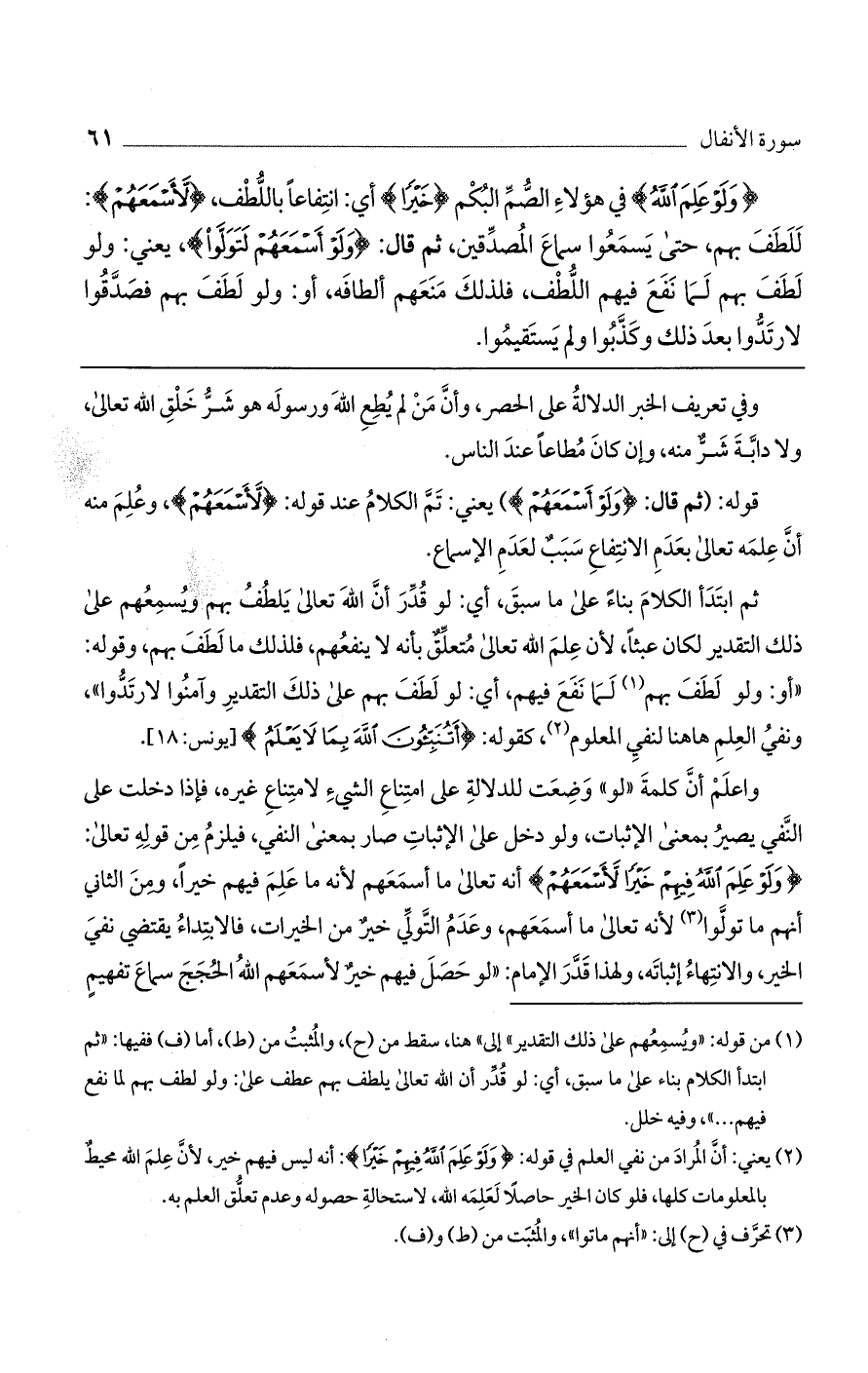قوله: (ثم قال: (وَلَوْ أَسْمَعَهُمْ) يعني: ثم الكلام عند قوله: (لأَسْمَعَهُمْ)، وعُلم منه أن علمه تعالى بعدم الانتفاع سبب لعدم الإسماع.