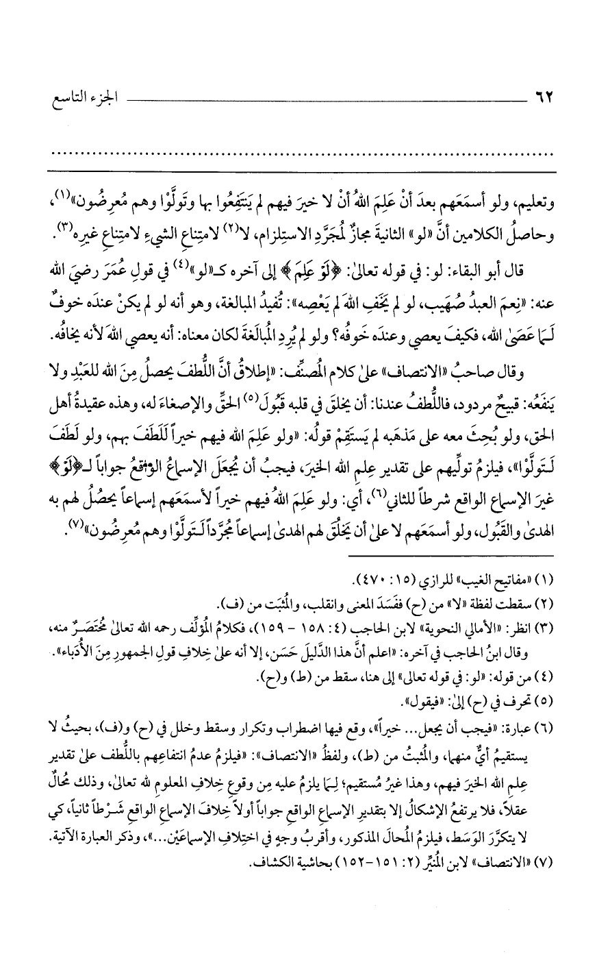 وقال صاحب "الانتصاف" على كلام المصنف: "إطلاق أن اللطف يحصل من الله للعبد ولا ينفعه: قبحي مردود، فاللطف عندنا: أن يخلق في قلبه قبولا لحق والإصغاء له، وهذه عقيدة أهل الحق، ولو بُحث معه على مذهبه لم يستقم قوله: "ولو علم الله فهيم خيراً للطف بهم، ولو لطف لتولوا"، فيلزم توليهم على تقدير علم الله الخير، فيجب أن يُجعل الإسماع الواقع جواباً لـ (لوْ) غير الإسماع الواقع شرطاً للثاني، أي: ولو علم الله فيهم خبراً لأسمعهم إسماعاً يحصل لهم به الهدى والقبول، ولو أسمعهم لا على ان يخلق لهم الهدى إسماعاً مجرداً لتولوا وهم معرضون".