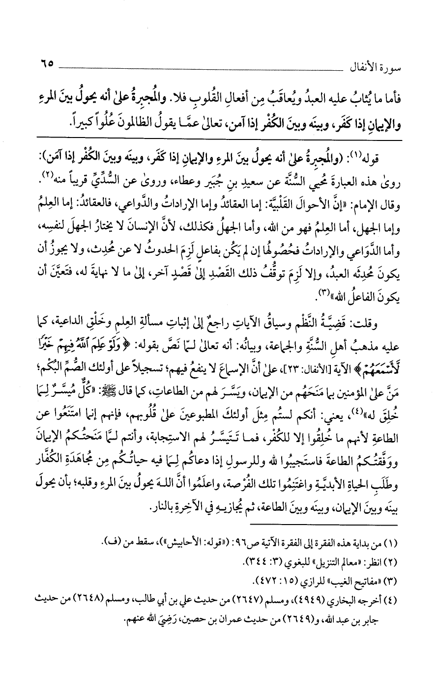 قوله: (والمجبرة على أنه يحول بين المرء والإيمان إذا كفر، وبينه وبين الكفر إذا آمن): روى هذه العبارة محيي السنة عن سعيد بن جبير وعطاء، وروى عن السدي قريباً منه: وقال الإمام: "إن الأحوال القلبية: إما العقائد وإما الإرادات والدواعي، فالعقائد: إما العلم وإما الجهل، أما العلم فهو من الله، وأما الجهل فكذلك، لأن الإنسان لا يختار الجهل لنفسه، وأما الدواعي والإرادات فحصولها إن لم يكن بفاعل لزم الحدوث لا عن محدث، ولا يجوز أن يكون محدثه العبد، وإلا لزم توقف ذلك القصد على قصد آخر، إلى ما لا نهاية له، فتعين أن يكون الفاعل الله".