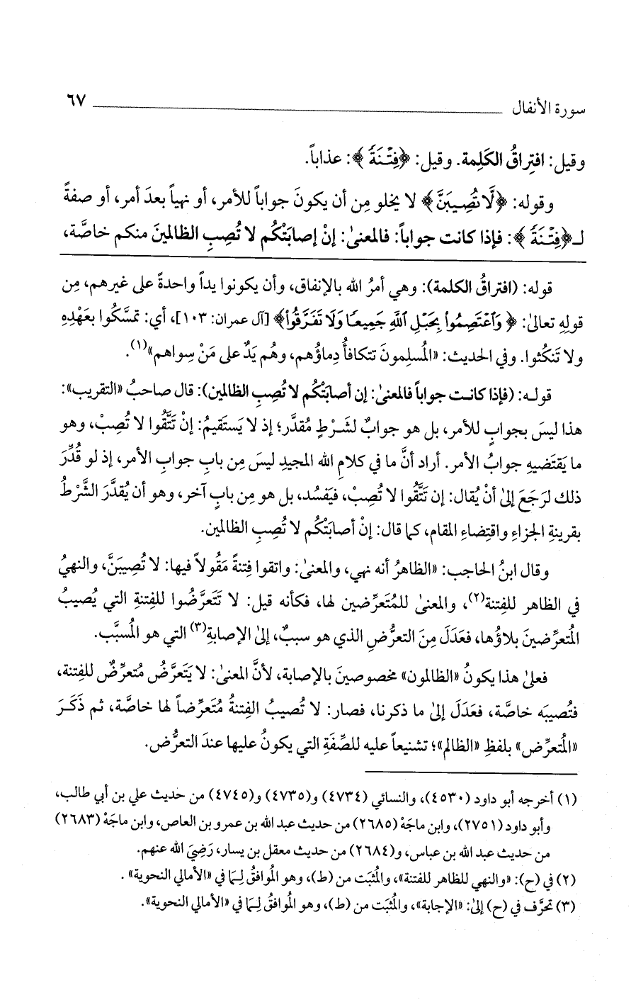 وقوله: (لا تُصِيبَنَّ) لا يخلو من أن يكون جواباً للأمر، أو نهياً بعد أمر، أو صفة لـ (فتنة): فإذا كانت جواباً: فالمعنى: إن إصابتكم لا تصيب الظالمين منكم خاصة،