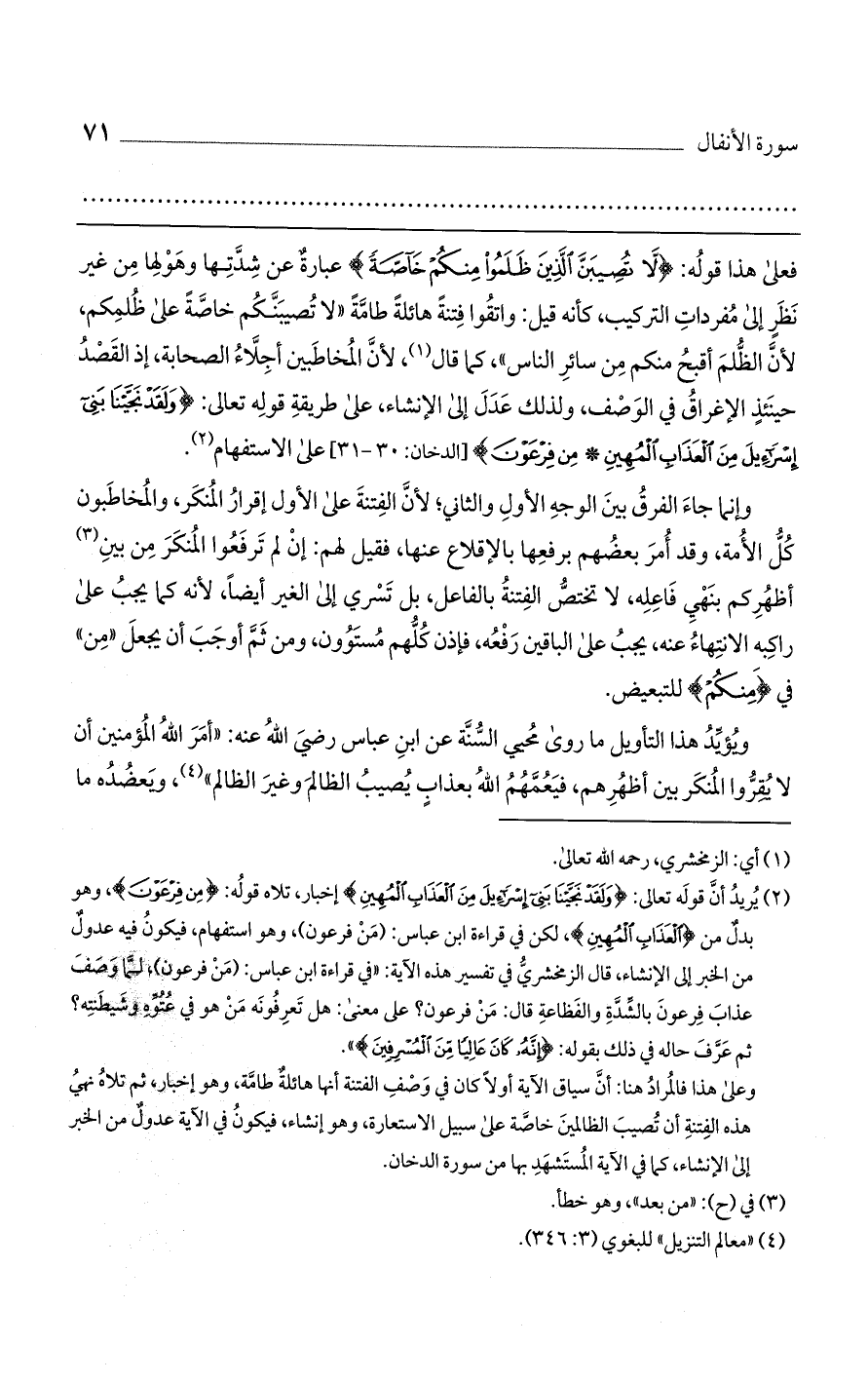 فعلى هذا قوله: (لا تُصِيبَنَّ الَّذِينَ ظَلَمُوا مِنْكُمْ خَاصَّةً) عبارة عن شدتها وهولها من غير نظر إلى مفردات التركيب، كأنه قيل: واتقوا فتنة هائلة طامة "لا تصيبنكم خاصة على ظلمكم، لأن الظلم أقبح منكم من سائر الناس"، كما قال، لأن المخاطبين أجلاء الصحابة، إذ القصد حينئذ الإغراق في الوصف، ولذلك عدل إلى الإنشاء، على طريقة قوله تعالى: (وَلَقَدْ نَجَّيْنَا بَنِي إِسْرَائِيلَ مِنْ الْعَذَابِ الْمُهِينِ * مِنْ فِرْعَوْنَ) [الدخان: 30 - 31] على الاستفهام.