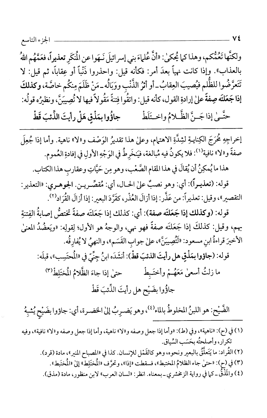قوله: (تعذيراً): أي: وهو نصبٌ على الحال، أي: مقصرين. الجوهري: "التعذير: التقصير"، وقيل: تعذيراً: من عذر: إذا أزال العذر، كقرد البعير: إذا أزال القُراد.