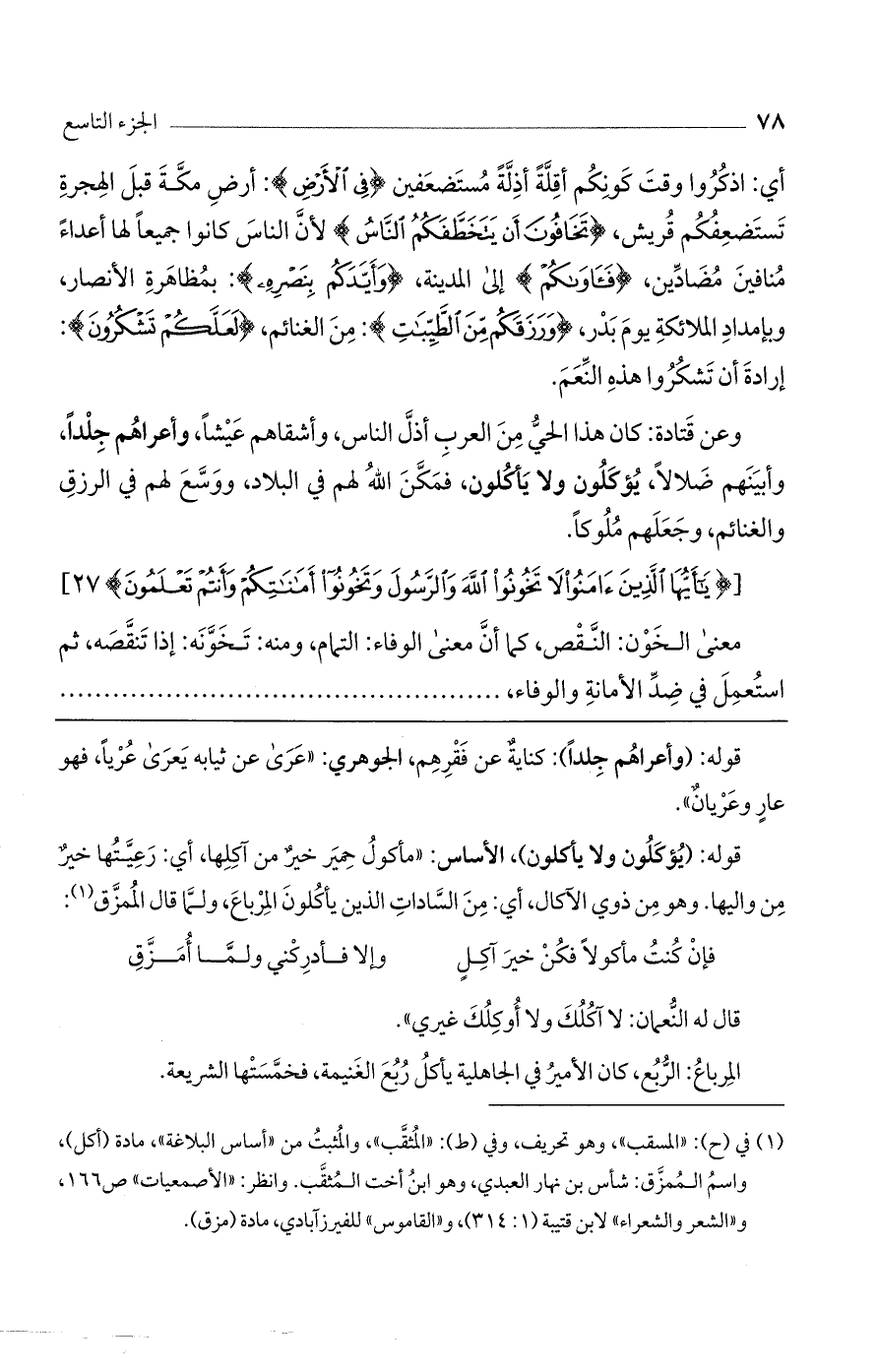 وعن قتادة: كان هذا الحي من العرب أذلّ الناس، وأشقاهم عيشا، وأعراهم جلداً، وأبينهم ضلالاً، يؤكلون ولا يأكلون، فمكن الله لهم في البلاد، ووسع لهم في الرزق والغنائم وجعلهم ملوكاً.