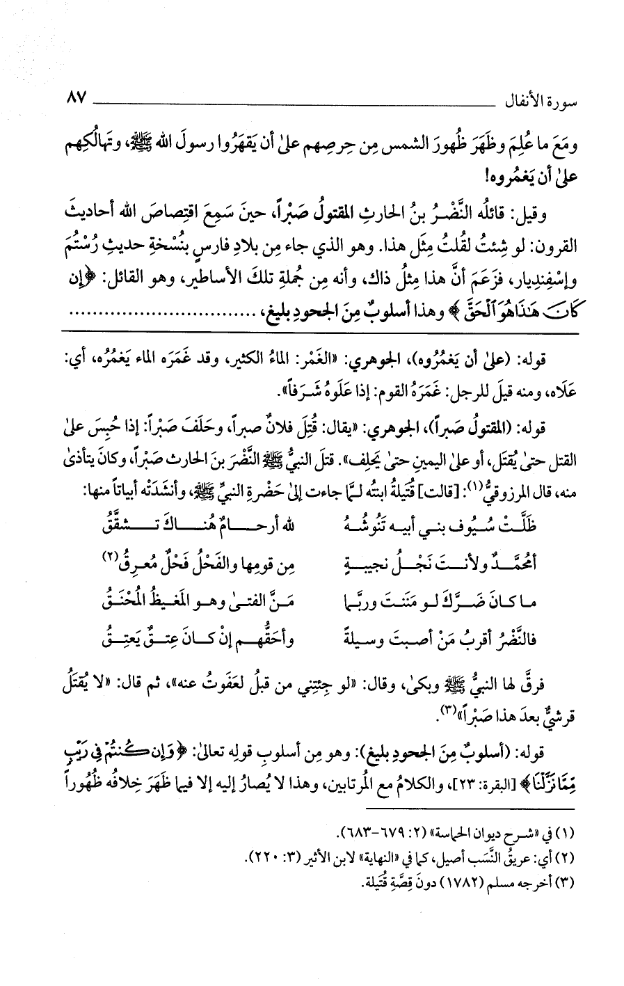 قوله: (المقتول صبراً)، الجوهري: "يقال: قُتل فلان صبراً، وحلف صبراً: إذا حُبس على القتل حتى يُقتل، أو على اليمين حتى يحلف". قتل النبي صلى الله عليه وسلم النضر بن الحارث صبراً، وكان يتأذى منه، قال المرزوقي: [قالت] قتيلة ابنته لما جاءت إلى حضرة النبي صلى الله عليه وسلم، وأنشدته أبياتاً منها: