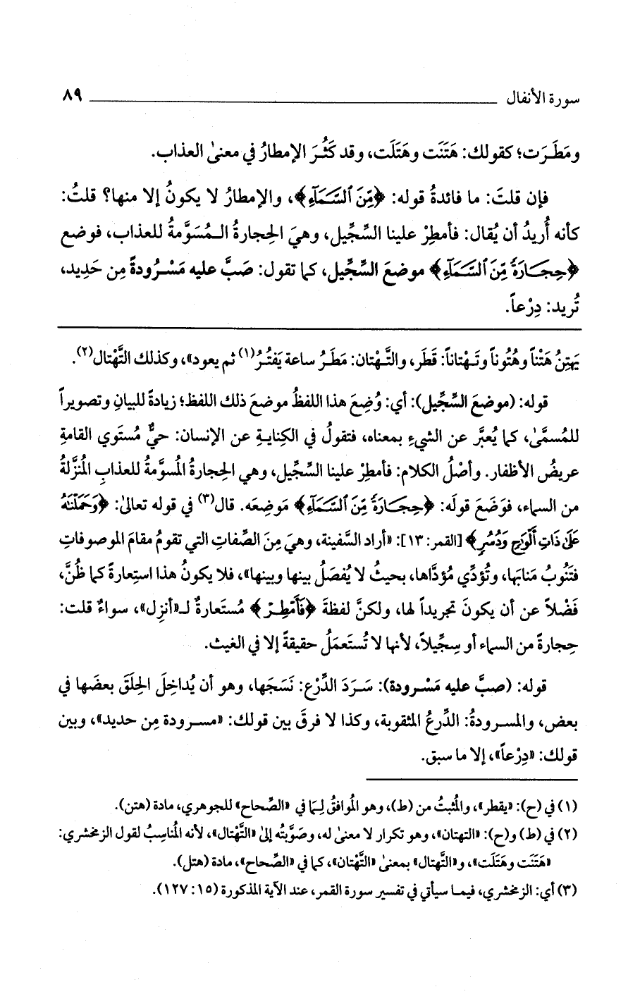 قوله: (موضع السجيل): أي: وُضع هذا اللفظ موضع ذلك اللفظ؛ زيادة للبيان وتصويراً للمسمى، كما يعبر عن الشيء بمعناه، فتقول في الكناية عن الإنسان: حي مستوى القامة عريض الأظفار. وأصل الكلام: فأمطر علينا السجيل، وهي الحجارة المسومة للعذاب المنزلة من السماء، فوضع قوله: (حِجَارَةً مِنْ السَّمَاءِ) موضعه. قال في قوله تعالى: (وَحَمَلْنَاهُ عَلَى ذَاتِ أَلْوَاحٍ وَدُسُرٍ) [القمر: 13]: "أراد السفينة، وهي من الصفات التي تقوم مقام الموصوفات فتنوب منابها، وتؤدي مؤداها، بحيث لا يفصل بينها وبينها"، فلا يكون هذا استعارة كما ظُن، فضلاً عن أن يكون تجريداً لها، ولكن لفظة (فَأَمْطِرْ) مستعارة لـ "أنزل"، سواء قلت: حجارة من السماء أو سجيلاً، لأنها لا تستعمل حقيقة إلا في الغيث.