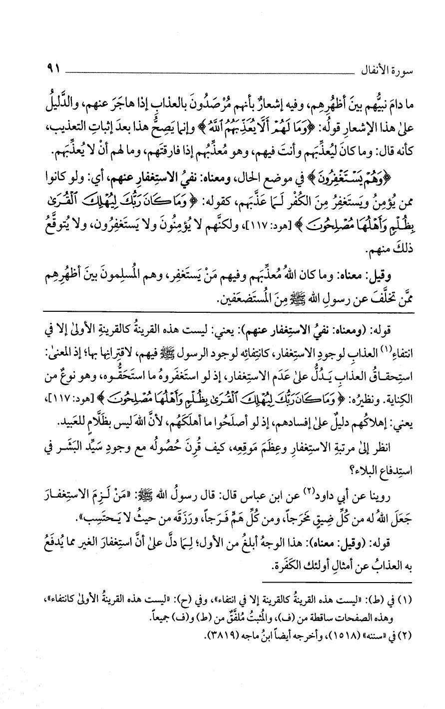 قوله: (ومعناه: نفي الاستغفار عنهم): يعني: ليست هذه القرينة كالقرينة الأولى إلا في انتفاء العذاب لوجود الاستغفار، كانتفائه لوجود الرسول صلى الله عليه وسلم فيهم، لاقترانها بها؛ إذ المعنى: استحقاق العذاب يدل على عدم الاستغفار، إذ لو استغفروه ما استحقوه، وهو نوع من الكناية. ونظيره: (وَمَا كَانَ رَبُّكَ لِيُهْلِكَ الْقُرَى بِظُلْمٍ وَأَهْلُهَا مُصْلِحُونَ) [هود: 117]، يعني: إهلاكهم دليل على إفسادهم، إذ لو أصلحوا ما أهلكهم، لأن الله ليس بظلام للعبيد.
