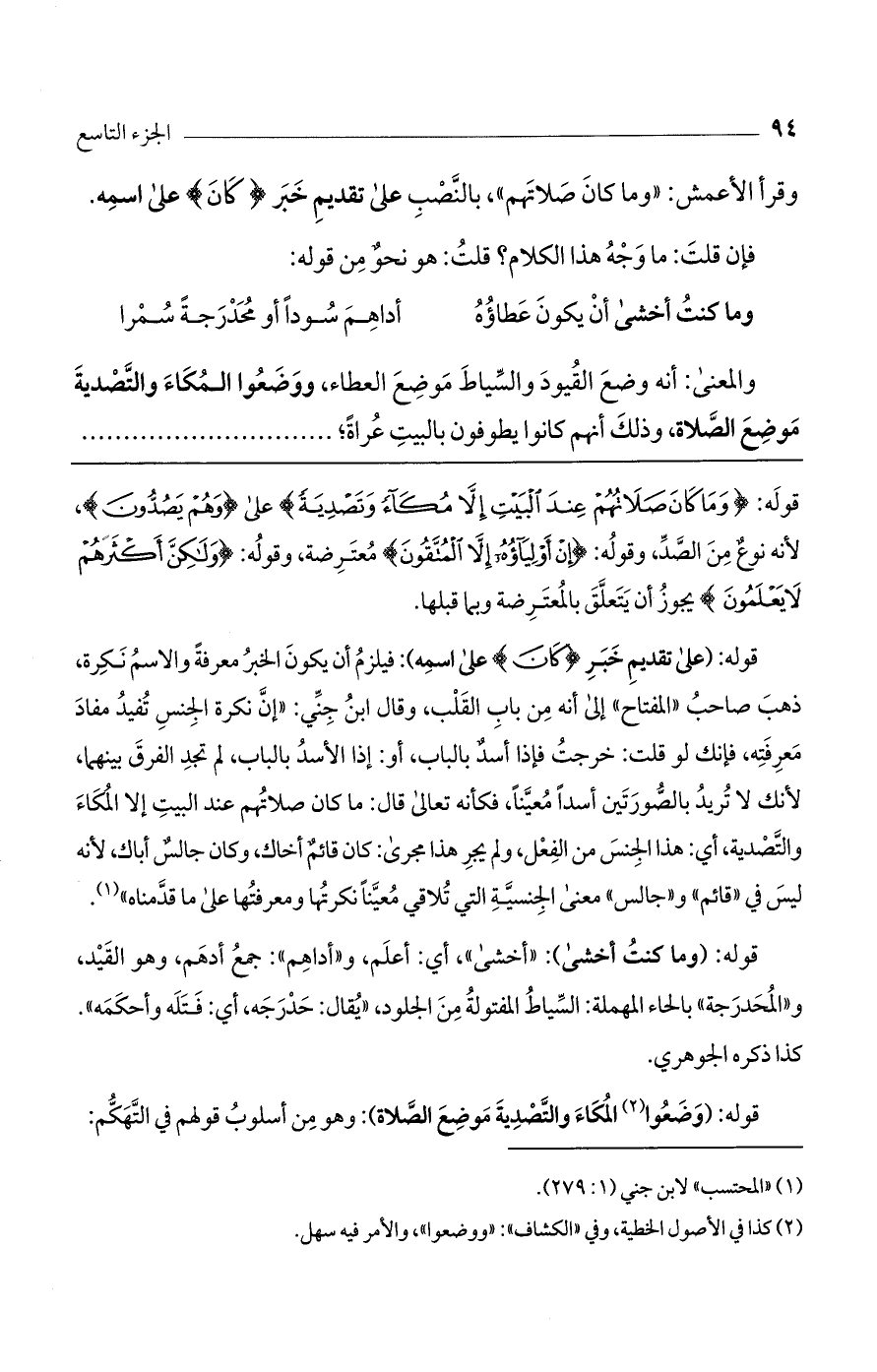 وقرأ الأعمش: "وما كان صلاتهم"، بالنصب على تقديم خبر (كان) على اسمه. فإن قلت: ما وجه هذا الكلام؟ قلت: هو نحو من قوله: