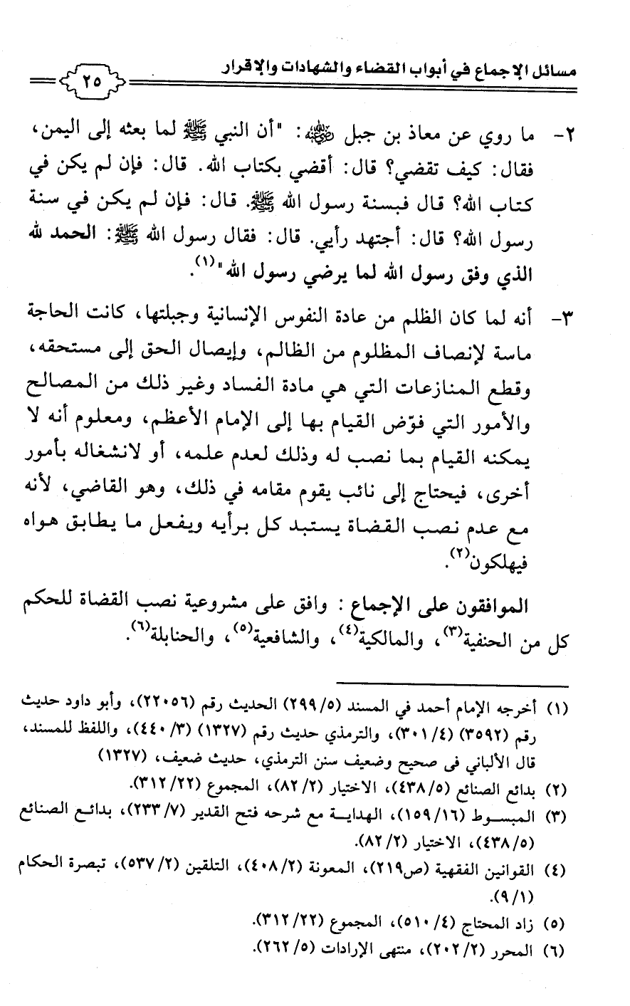 • الموافقون على الإجماع: وافق على مشروعية نصب القضاة للحكم كل من الحنفية (¬3)، والمالكية (¬4)، والشافعية (¬5)، والحنابلة (¬6).