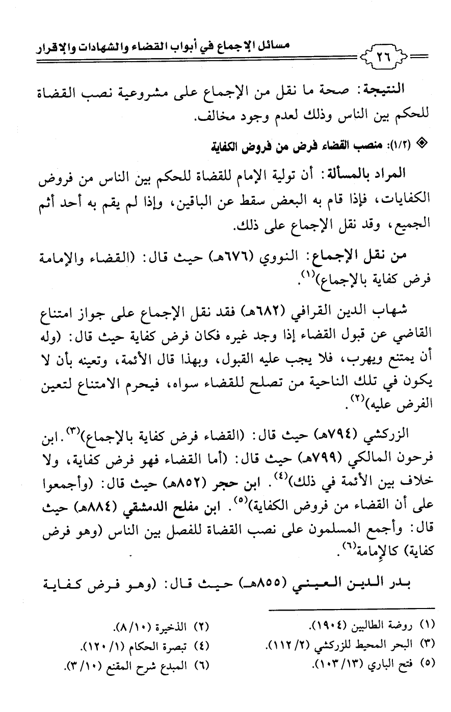• من نقل الإجماع: النووي (676 هـ) حيث قال: (القضاء والإمامة فرض كفاية بالإجماع) (¬1).