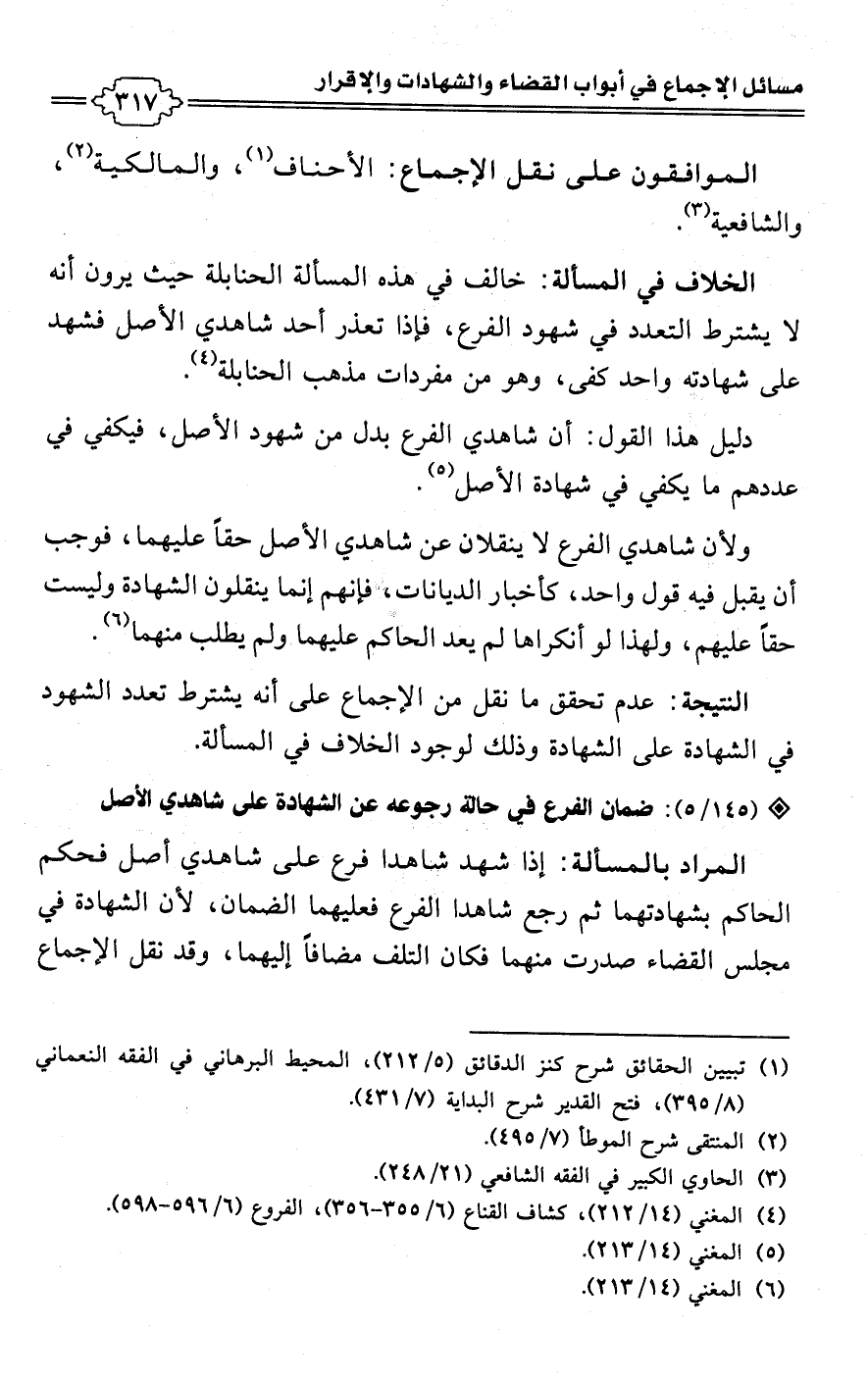 ولأن شاهدي الفرع لا ينقلان عن شاهدي الأصل حقًا عليهما، فوجب أن يقبل فيه قول واحد، كأخبار الديانات، فإنهم إنما ينقلون الشهادة وليست حقًا عليهم، ولهذا لو أنكراها لم يعد الحاكم عليهما ولم يطلب منهما (¬6).Rعدم تحقق ما نقل من الإجماع على أنه يشترط تعدد الشهود في الشهادة على الشهادة وذلك لوجود الخلاف في المسألة.