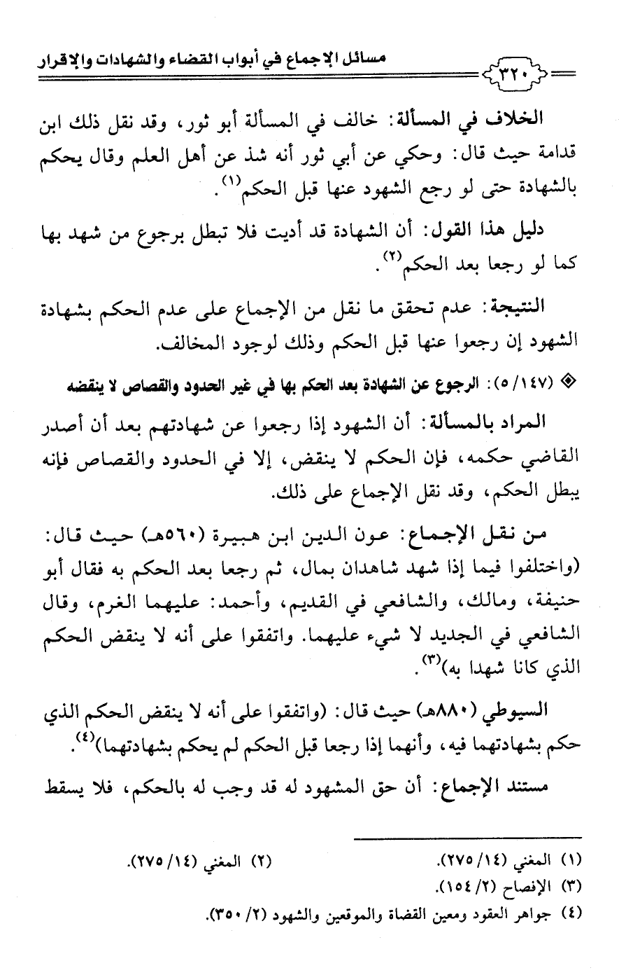• من نقل الإجماع: عون الدين ابن هبيرة (560 هـ) حيث قال: (واختلفوا فيما إذا شهد شاهدان بمال، ثم رجعا بعد الحكم به فقال أبو حنيفة، ومالك، والشافعي في القديم، وأحمد: عليهما الغرم، وقال الشافعي في الجديد لا شيء عليهما. واتفقوا على أنه لا ينقض الحكم الذي كانا شهدا به) (¬3).