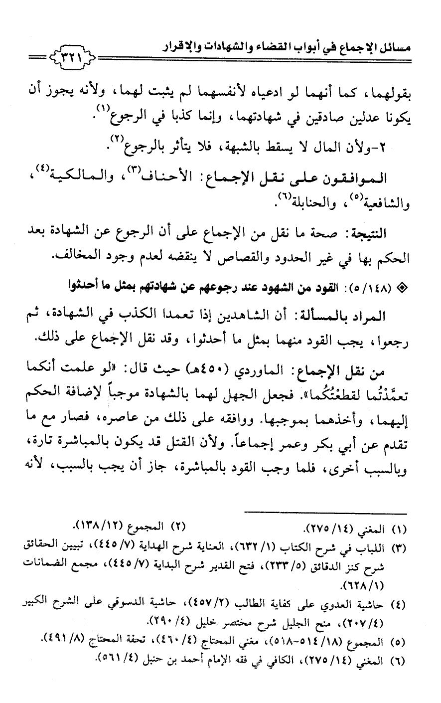• الموافقون على نقل الإجماع: الأحناف (¬3)، والمالكية (¬4)، والشافعية (¬5)، والحنابلة (¬6).Rصحة ما نقل من الإجماع على أن الرجوع عن الشهادة بعد الحكم بها في غير الحدود والقصاص لا ينقضه لعدم وجود المخالف.