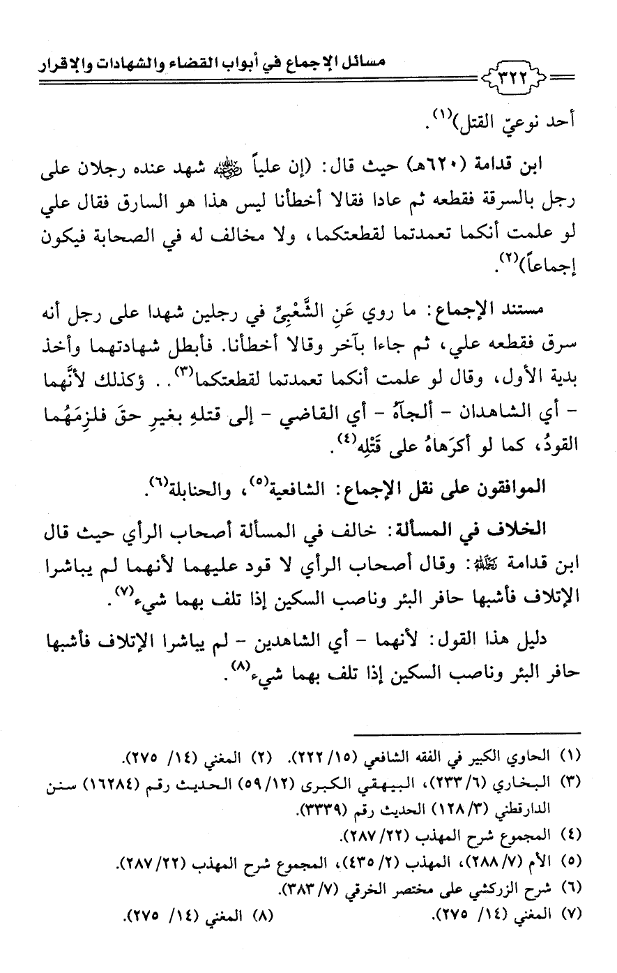 ابن قدامة (620 هـ) حيث قال: (إن عليًا -رضي اللَّه عنه- شهد عنده رجلان على رجل بالسرقة فقطعه ثم عادا فقالا أخطأنا ليس هذا هو السارق فقال علي لو علمت أنكما تعمدتما لقطعتكما، ولا مخالف له في الصحابة فيكون إجماعًا) (¬2).