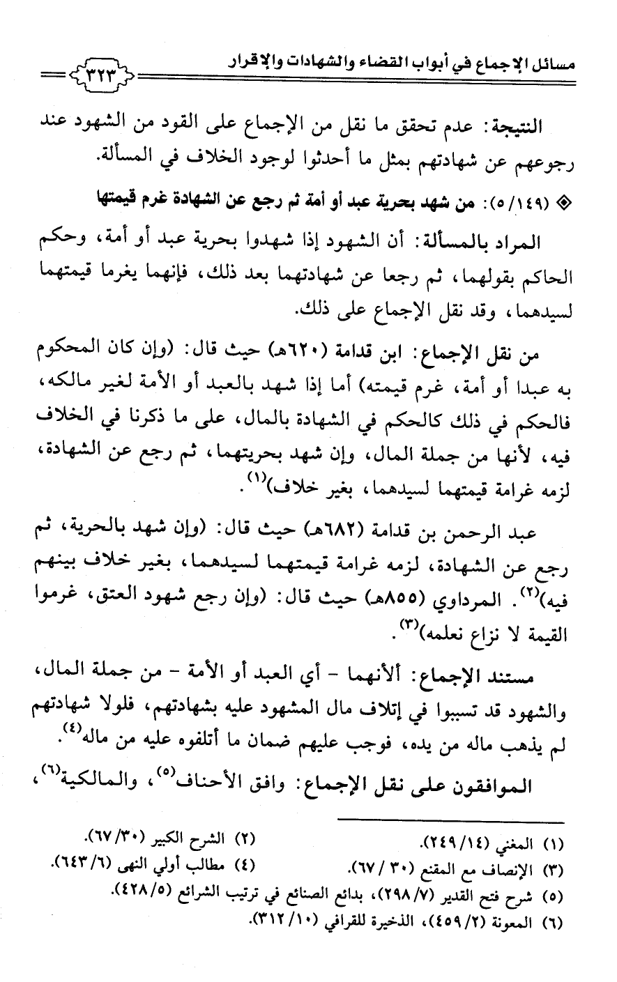 عبد الرحمن بن قدامة (682 هـ) حيث قال: (وإن شهد بالحرية، ثم رجع عن الشهادة، لزمه غرامة قيمتهما لسيدهما، بغير خلاف بينهم فيه) (¬2). المرداوي (855 هـ) حيث قال: (وإن رجع شهود العتق، غرموا القيمة لا نزاع نعلمه) (¬3).