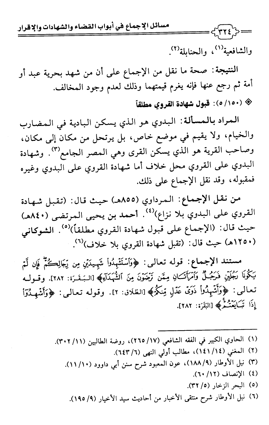 • من نقل الإجماع: المرداوي (855 هـ) حيث قال: (تقبل شهادة القروي على البدوي بلا نزاع) (¬4). أحمد بن يحيى المرتضى (840 هـ) حيث قال: (الإجماع على قبول شهادة القروي مطلقًا) (¬5). الشوكاني (1250 هـ) حيث قال: (تقبل شهادة القروي بلا خلاف) (¬6).
