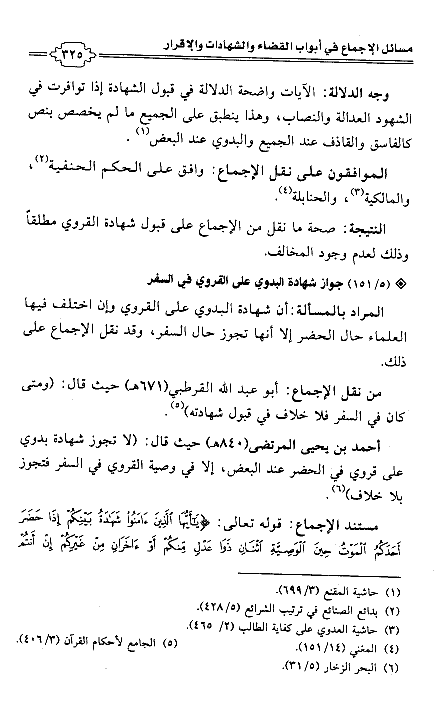 • من نقل الإجماع: أبو عبد اللَّه القرطبي (671 هـ) حيث قال: (ومتى كان في السفر فلا خلاف في قبول شهادته) (¬5).