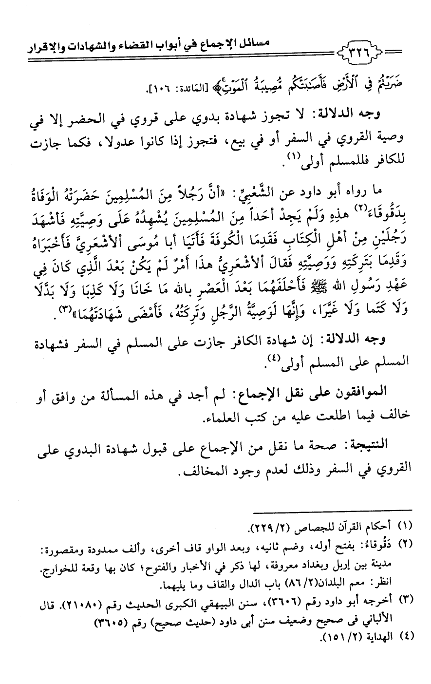 • وجه الدلالة: لا تجوز شهادة بدوي على قروي في الحضر إلا في وصية القروي في السفر أو في بيع، فتجوز إذا كانوا عدولا، فكما جازت للكافر فللمسلم أولى (¬1).