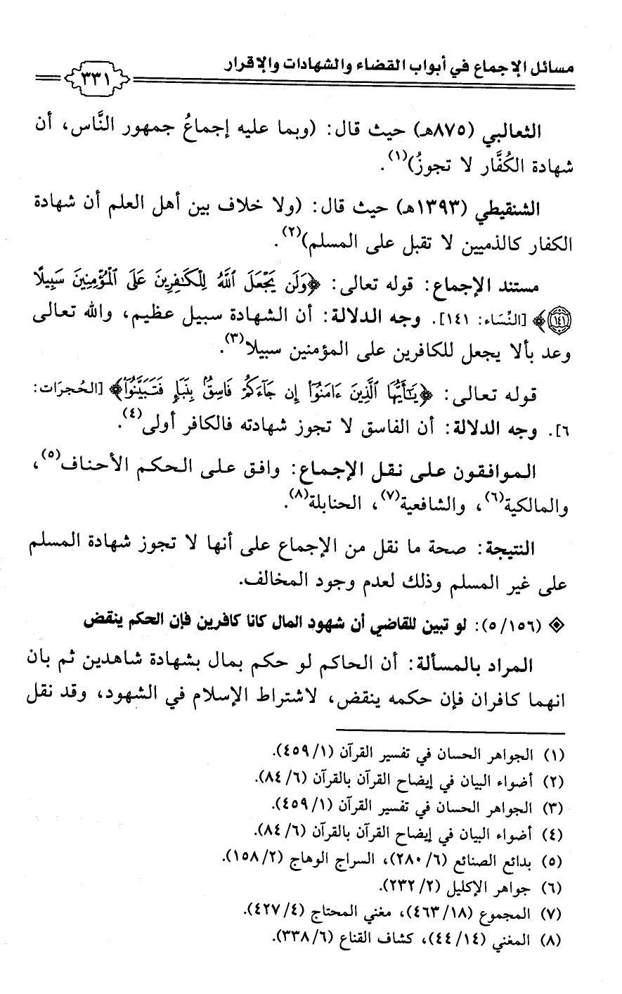 الثعالبي (875 هـ) حيث قال: (وبما عليه إجماعُ جمهور النَّاس، أن شهادة الكُفَّار لا تجوزُ) (¬1).