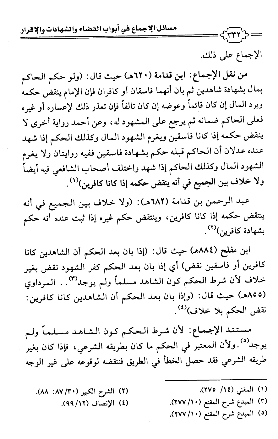 ابن مفلح (884 هـ) حيث قال: (إذا بان بعد الحكم أن الشاهدين كانا كافرين أو فاسقين نقض) أي إذا بأن بعد الحكم كفر الشهود نقض بغير خلاف لأن شرط الحكم كون الشاهد مسلمًا ولم يوجد (¬3). . المرداوي (855 هـ) حيث قال: (وإذا بان بعد الحكم أن الشاهدين كانا كافرين: نقض الحكم بلا خلاف) (¬4).