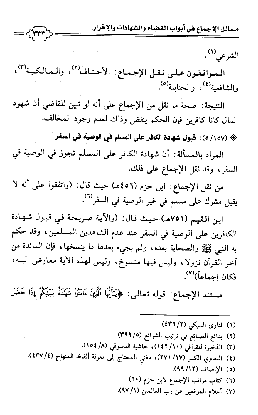 ابن القيم (751 هـ) حيث قال: (والآية صريحة في قبول شهادة الكافرين على الوصية في السفر عند عدم الشاهدين المسلمين، وقد حكم به النبي -صلى اللَّه عليه وسلم- والصحابة بعده، ولم يجيء بعدها ما ينسخها، فإن المائدة من آخر القرآن نزولا، وليس فيها منسوخ، وليس لهذه الآية معارض البته، فكان إجماعًا (¬7).