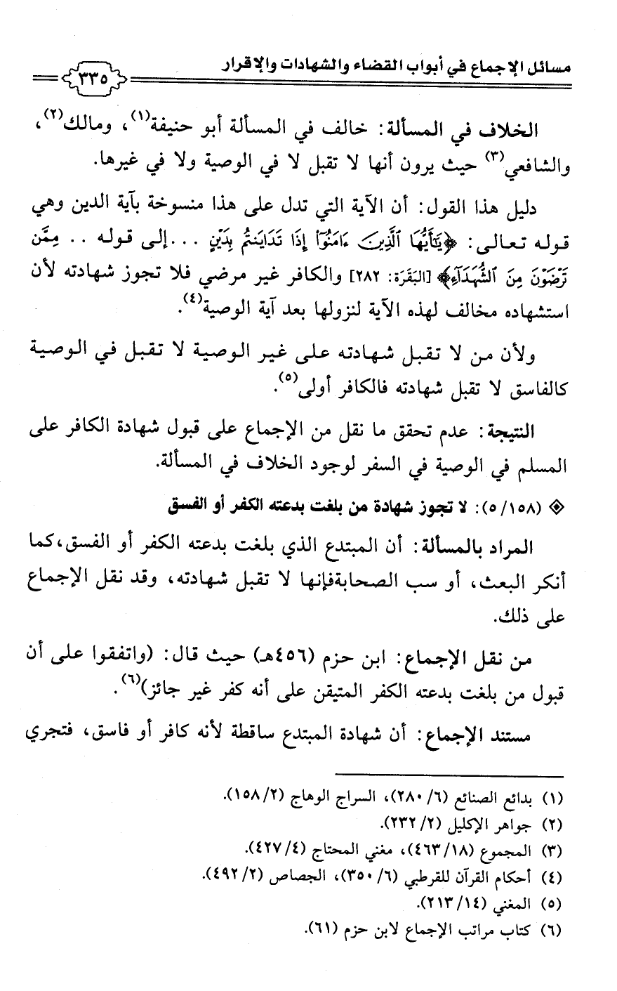 ولأن من لا تقبل شهادته على غير الوصية لا تقبل في الوصية كالفاسق لا تقبل شهادته فالكافر أولى (¬5).Rعدم تحقق ما نقل من الإجماع على قبول شهادة الكافر على المسلم في الوصية في السفر لوجود الخلاف في المسألة.