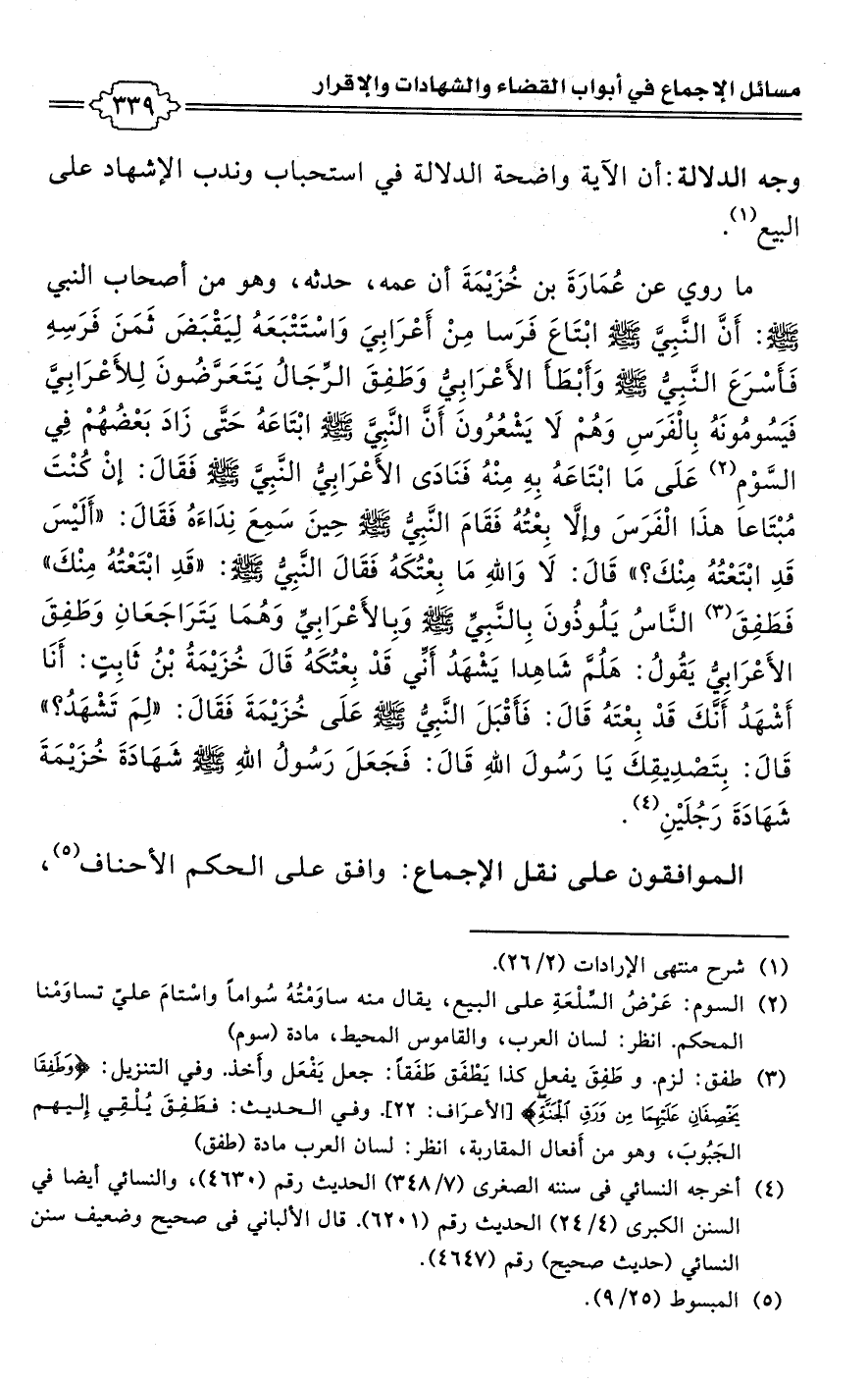 ما روي عن عُمَارَةَ بن خُزَيْمَةَ أن عمه، حدثه، وهو من أصحاب النبي -صلى اللَّه عليه وسلم-: أَنَّ النَّبِيَّ -صلى اللَّه عليه وسلم- ابْتَاعَ فَرَسا مِنْ أَعْرَابِيَ وَاسْتَتْبَعَهُ لِيَقْبَضَ ثَمَنَ فَرَسِهِ فَأَسْرَعَ النَّبِيُّ -صلى اللَّه عليه وسلم- وَأَبْطَأَ الأَعْرَابِيُّ وَطَفِقَ الرِّجَالُ يَتَعَرَّضُونَ لِلأَعْرَابِيَّ فَيَسُومُونَهُ بِالْفَرَسِ وَهُمْ لَا يَشْعُرُونَ أَنَّ النَّبِيَّ -صلى اللَّه عليه وسلم- ابْتَاعَهُ حَتَّى زَادَ بَعْضُهُمْ فِي السَّوْمِ (¬2) عَلَى مَا ابْتَاعَهُ بِهِ مِنْهُ فَنَادَى الأَعْرَابِيُّ النَّبِيَّ -صلى اللَّه عليه وسلم- فَقَالَ: إنْ كُنْتَ مُبْتَاعا هذَا الْفَرَسَ وإلَّا بِعْتُهُ فَقَامَ النَّبِيُّ -صلى اللَّه عليه وسلم- حِينَ سَمِعَ نِدَاءَهُ فَقَالَ: "أَلَيْسَ قَدِ ابْتَعْتُهُ مِنْكَ؟ " قَالَ: لَا وَاللَّهِ مَا بِعْتُكَهُ فَقَالَ النَّبِيُّ -صلى اللَّه عليه وسلم-: "قَدِ ابْتَعْتُهُ مِنْكَ" فَطَفِقَ (¬3) النَّاسُ يَلُوذُونَ بِالنَّبِيِّ -صلى اللَّه عليه وسلم- وبِالأَعْرَابِيِّ وَهُمَا يَتَرَاجَعَانِ وَطَفِقَ الأَعْرَابِيُّ يَقُولُ: هَلُمَّ شَاهِدا يَشْهَدُ أَنِّي قَدْ بِعْتُكَهُ قَالَ خُزَيْمَةُ بْنُ ثَابِتٍ: أَنَا أَشْهَدُ أَنَّكَ قَدْ بِعْتَهُ قَالَ: فَأَقْبَلَ النَّبِيُّ -صلى اللَّه عليه وسلم- عَلَى خُزَيْمَةَ فَقَالَ: "لِمَ تَشْهَدُ؟ " قَالَ: بِتَصْدِيقِكَ يَا رَسولَ اللَّهِ قَالَ: فَجَعَلَ رَسولُ اللَّهِ -صلى اللَّه عليه وسلم- شَهَادَةَ خُزَيْمَةَ شَهَادَةَ رَجُلَيْنِ (¬4).