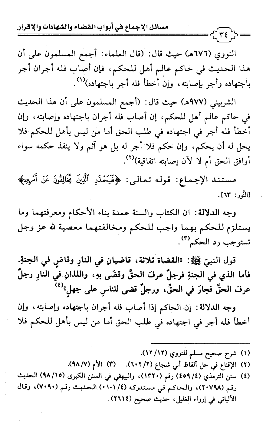 النووي (676 هـ) حيث قال: (قال العلماء: أجمع المسلمون على أن هذا الحديث في حاكم عالم أهل للحكم، فإن أصاب فله أجران أجر باجتهاده وأجر بإصابته، وإن أخطأ فله أجر باجتهاده) (¬1).