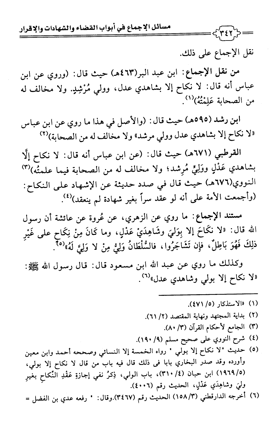 • من نقل الإجماع: ابن عبد البر (463 هـ) حيث قال: (وروي عن ابن عباس أنه قال: لا نكاح إلا بشاهدي عدل، وولي مُرْشِدٍ. ولا مخالف له من الصحابة عَلِمْتُهُ) (¬1).