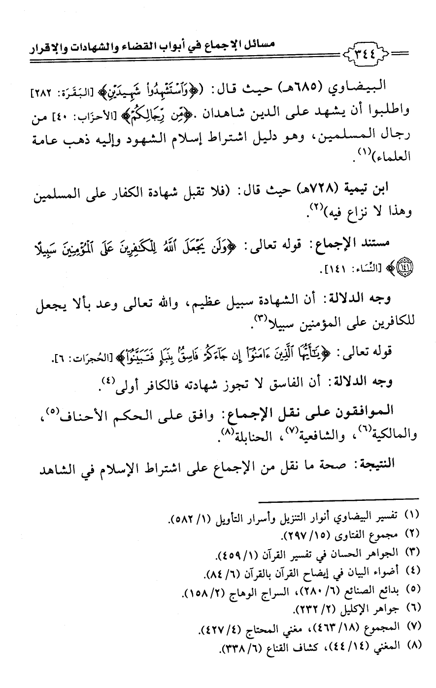 البيضاوي (685 هـ) حيث قال: ({وَاسْتَشْهِدُوا شَهِيدَيْنِ} [البقرة: 282] واطلبوا أن يشهد على الدين شاهدان. {مِنْ رِجَالِكُمْ} [الأحزاب: 40] من رجال المسلمين، وهو دليل اشتراط إسلام الشهود وإليه ذهب عامة العلماء) (¬1).