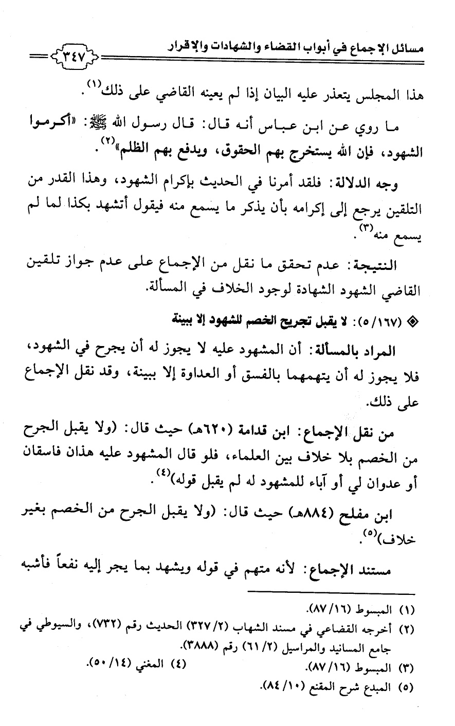 • من نقل الإجماع: ابن قدامة (620 هـ) حيث قال: (ولا يقبل الجرح من الخصم بلا خلاف بين العلماء، فلو قال المشهود عليه هذان فاسقان أو عدوان لي أو آباء للمشهود له لم يقبل قوله) (¬4).