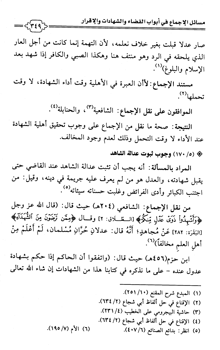 • من نقل الإجماع: الشافعي (204 هـ) حيث قال: (قال اللَّه عز وجل {وَأَشْهِدُوا ذَوَيْ عَدْلٍ مِنْكُمْ} [الطلاق: 2] وقال {مِمَّنْ تَرْضَوْنَ مِنَ الشُّهَدَاءِ} [البقرة: 282] عَنْ مُجاهدٍ؛ أَنَّهُ قال: عدلانِ حُرَّانِ مُسْلمان، لَمْ أَعْلَمْ مِنْ أهلِ العلمِ مخالفًا) (¬6).