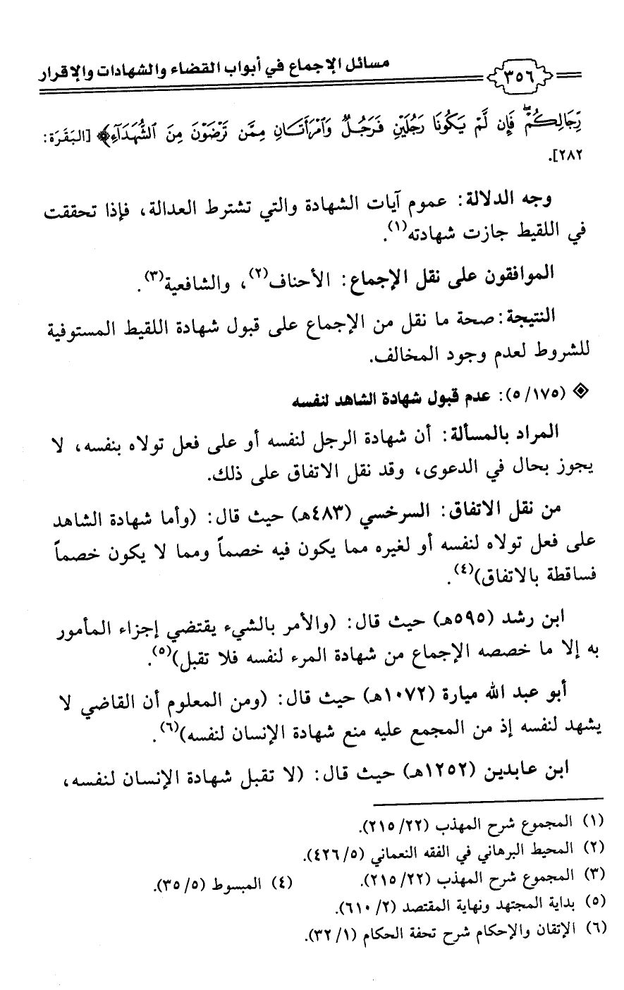 أبو عبد اللَّه ميارة (1072 هـ) حيث قال: (ومن المعلوم أن القاضي لا يشهد لنفسه إذ من المجمع عليه منع شهادة الإنسان لنفسه) (¬6).