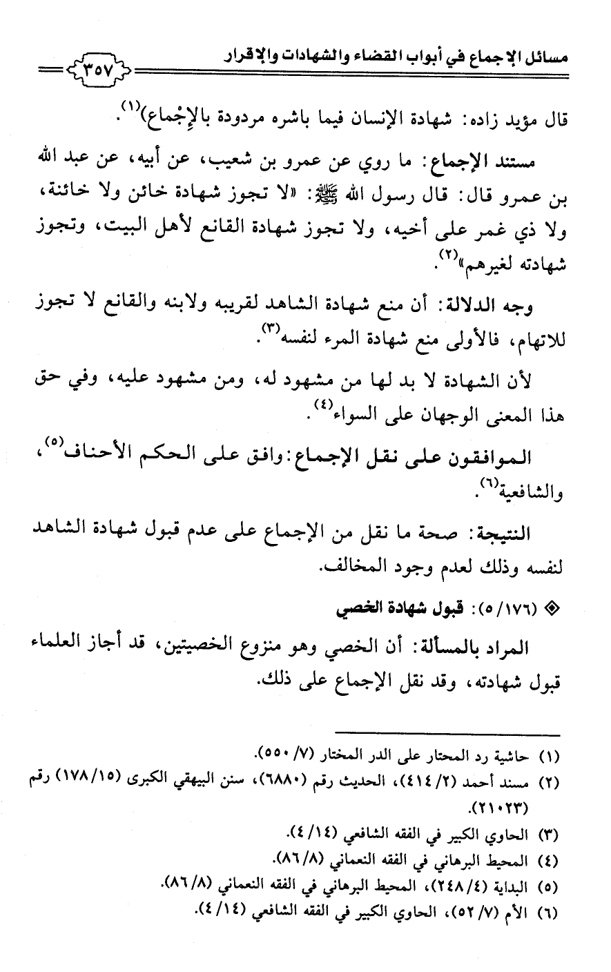 • الموافقون على نقل الإجماع: وافق على الحكم الأحناف (¬5)، والشافعية (¬6).Rصحة ما نقل من الإجماع على عدم قبول شهادة الشاهد لنفسه وذلك لعدم وجود المخالف.