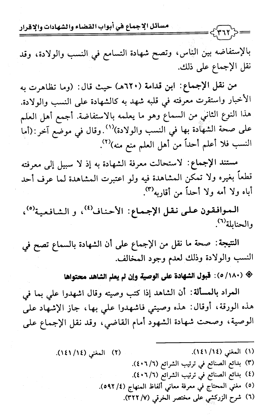 • من نقل الإجماع: ابن قدامة (620 هـ) حيث قال: (وما تظاهرت به الأخبار واستقرت معرفته في قلبه شهد به كالشهادة على النسب والولادة. هذا النوع الثاني من السماع وهو ما يعلمه بالاستفاضة. أجمع أهل العلم على صحة الشهادة بها في النسب والولادة) (¬1). وقال في موضع آخر: (أما النسب فلا أعلم أحدًا من أهل العلم منع منه) (¬2).