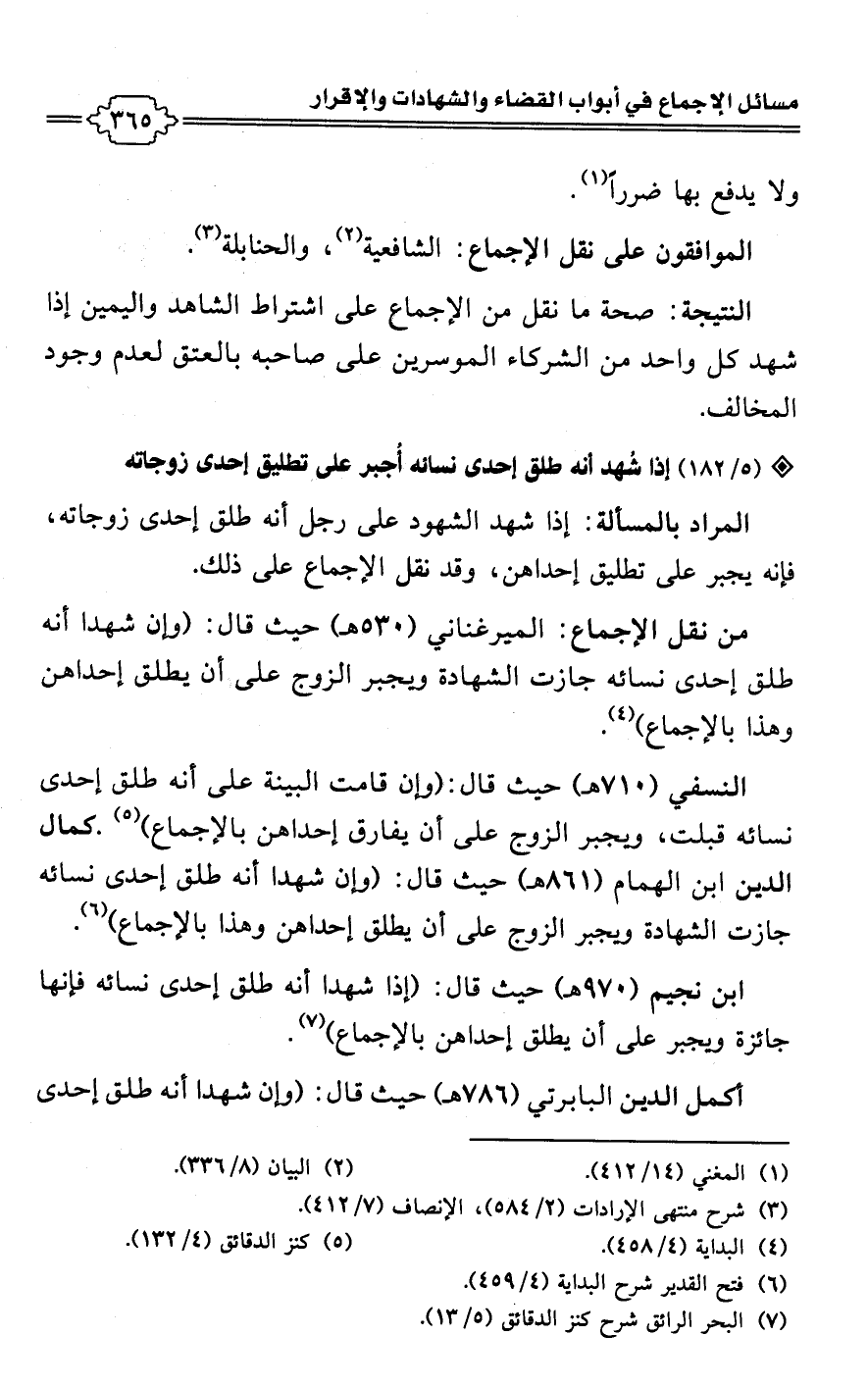 • من نقل الإجماع: الميرغناني (530 هـ) حيث قال: (وإن شهدا أنه طلق إحدى نسائه جازت الشهادة ويجبر الزوج على أن يطلق إحداهن وهذا بالإجماع) (¬4).