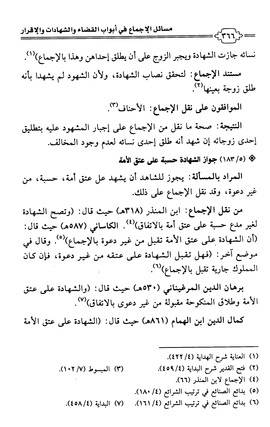 • من نقل الإجماع: ابن المنذر (318 هـ) حيث قال: (وتصح الشهادة لغير مدع حسبة على عتق أمة بالاتفاق) (¬4). الكاساني (587 هـ) حيث قال: (أن الشهادة على عتق الأمة تقبل من غير دعوة بالإجماع) (¬5). وقال في موضع آخر: (فهل تقبل الشهادة على عتقه من غير دعوة، فإن كان المملوك جارية تقبل بالإجماع) (¬6).