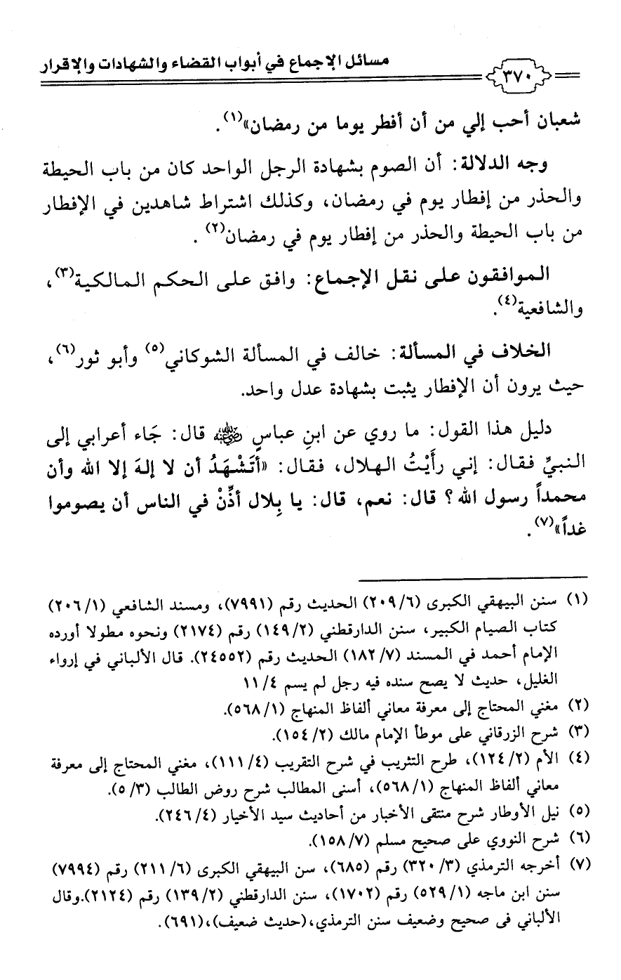 • وجه الدلالة: أن الصوم بشهادة الرجل الواحد كان من باب الحيطة والحذر من إفطار يوم في رمضان، وكذلك اشتراط شاهدين فى الإفطار من باب الحيطة والحذر من إفطار يوم في رمضان (¬2).