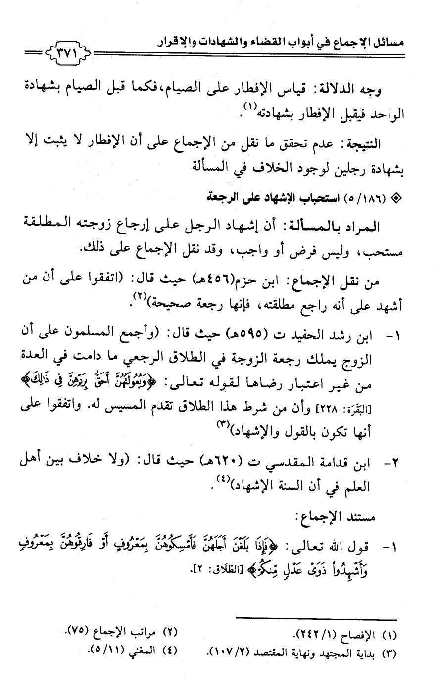 • من نقل الإجماع: ابن حزم (456 هـ) حيث قال: (اتفقوا على أن من أشهد على أنه راجع مطلقته، فإنها رجعة صحيحة) (¬2).