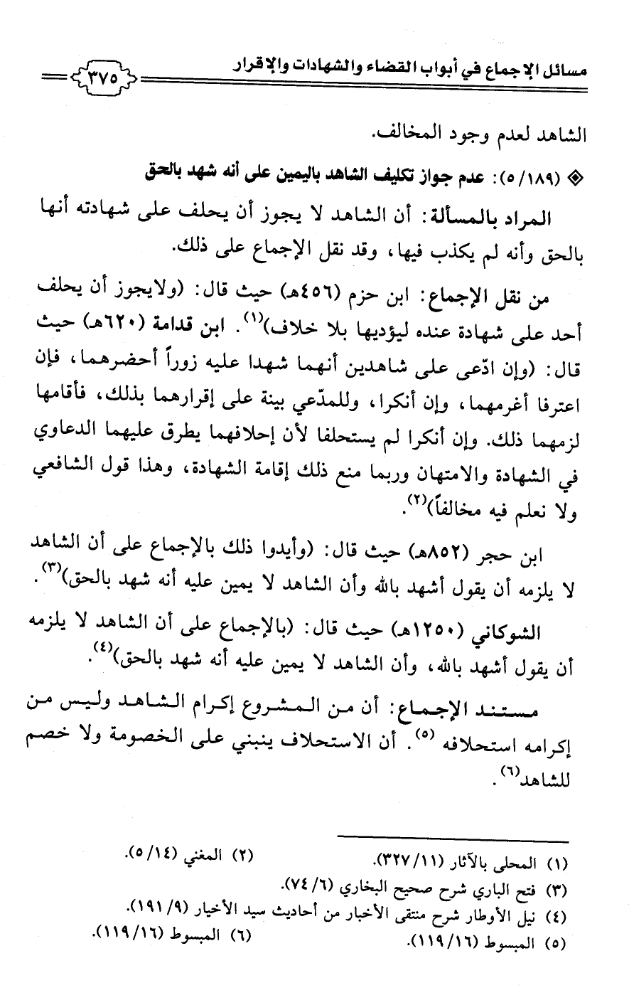 • مستند الإجماع: أن من المشروع إكرام الشاهد وليس من إكرامه استحلافه (¬5). أن الاستحلاف ينبني على الخصومة ولا خصم للشاهد (¬6).
