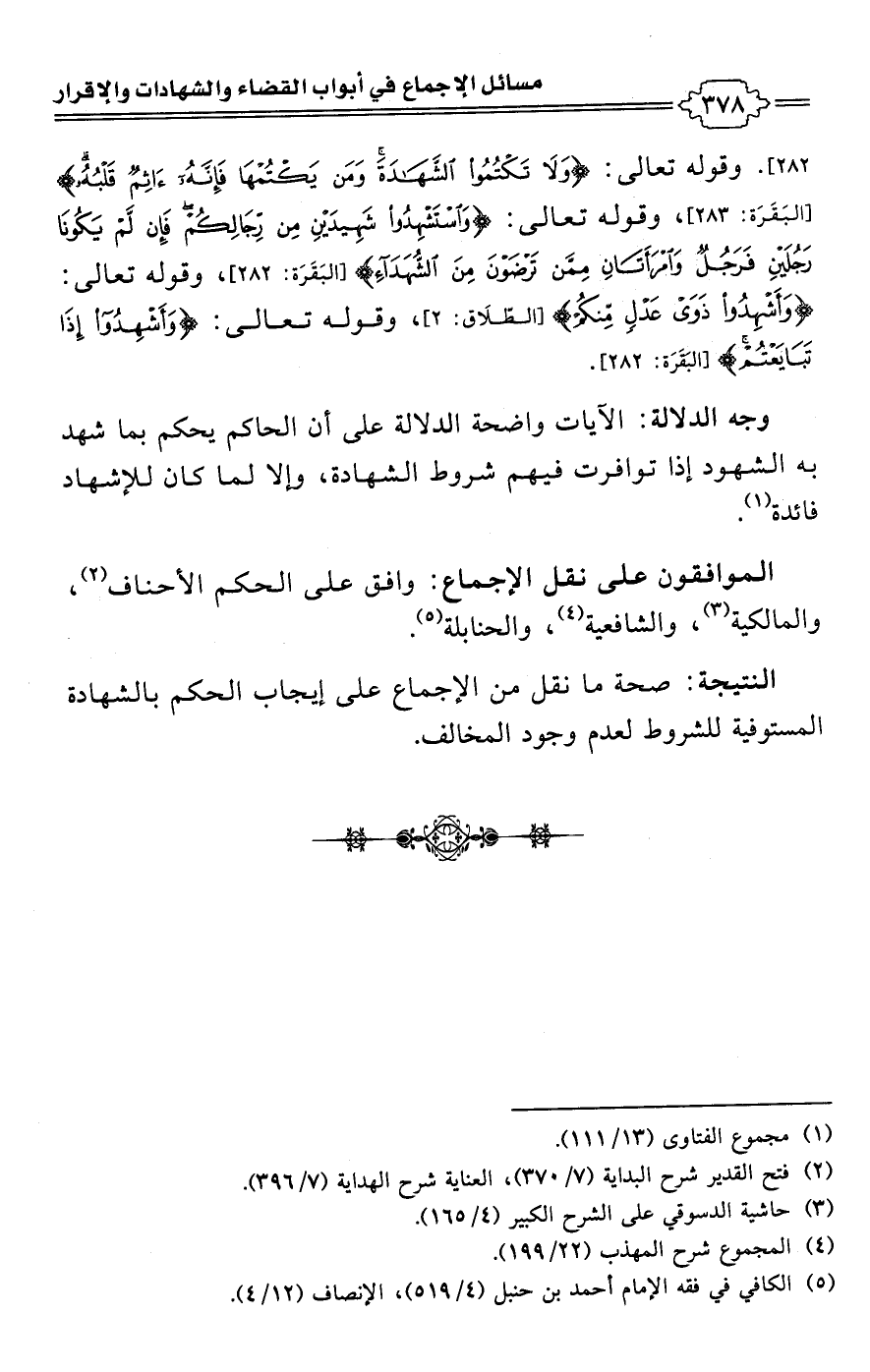 • الموافقون على نقل الإجماع: وافق على الحكم الأحناف (¬2)، والمالكية (¬3)، والشافعية (¬4)، والحنابلة (¬5).Rصحة ما نقل من الإجماع على إيجاب الحكم بالشهادة المستوفية للشروط لعدم وجود المخالف.