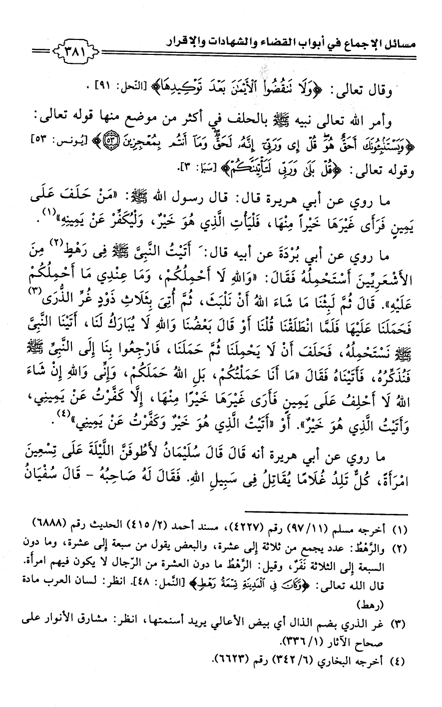 ما روي عن أبي بُرْدَةَ عن أبيه قال: أَتَيْتُ النَّبِىَّ -صلى اللَّه عليه وسلم- فِى رَهْطٍ (¬2) مِنَ الأَشْعَرِيِّينَ أَسْتَحْمِلُهُ فَقَالَ: "وَاللَّهِ لَا أَحْمِلُكمْ، وَمَا عِنْدِي مَا أَحْمِلُكُمْ عَلَيْهِ". قَالَ ثُمَّ لَبِثْنَا مَا شَاءَ اللَّهُ أَنْ نَلْبَثَ، ثُمَّ أُتِىَ بِثَلَاثِ ذَوْدٍ غُرِّ الذُّرَى (¬3) فَحَمَلَنَا عَلَيْهَا فَلَمَّا انْطَلَقْنَا قُلْنَا أَوْ قَالَ بَعْضُنَا وَاللَّهِ لَا يُبَارَكُ لنَا، أَتَيْنَا النَّبِىَّ -صلى اللَّه عليه وسلم- نَسْتَحْمِلُهُ، فَحَلَفَ أَنْ لَا يَحْمِلَنَا ثُمَّ حَمَلَنَا، فَارْجِعُوا بِنَا إِلَى النَّبِىِّ -صلى اللَّه عليه وسلم- فَنُذَكِّرُهُ، فَأَتَيْنَاهُ فَقَالَ "مَا أَنَا حَمَلْتُكُمْ، بَلِ اللَّهُ حَمَلَكُمْ، وَإِنِّى وَاللَّهِ إِنْ شَاءَ اللَّهُ لَا أَحْلِفُ عَلَى يَمِينٍ فَأَرَى غَيْرَهَا خَيْرًا مِنْهَا، إِلَّا كَفرْتُ عَنْ يَمِينِي، وَأَتَيْتُ الَّذِي هُوَ خَيْرٌ". أَوْ "أَتَيْتُ الَّذِي هُوَ خَيْز وَكَفَّرْتُ عَنْ يَمِينِي" (¬4).