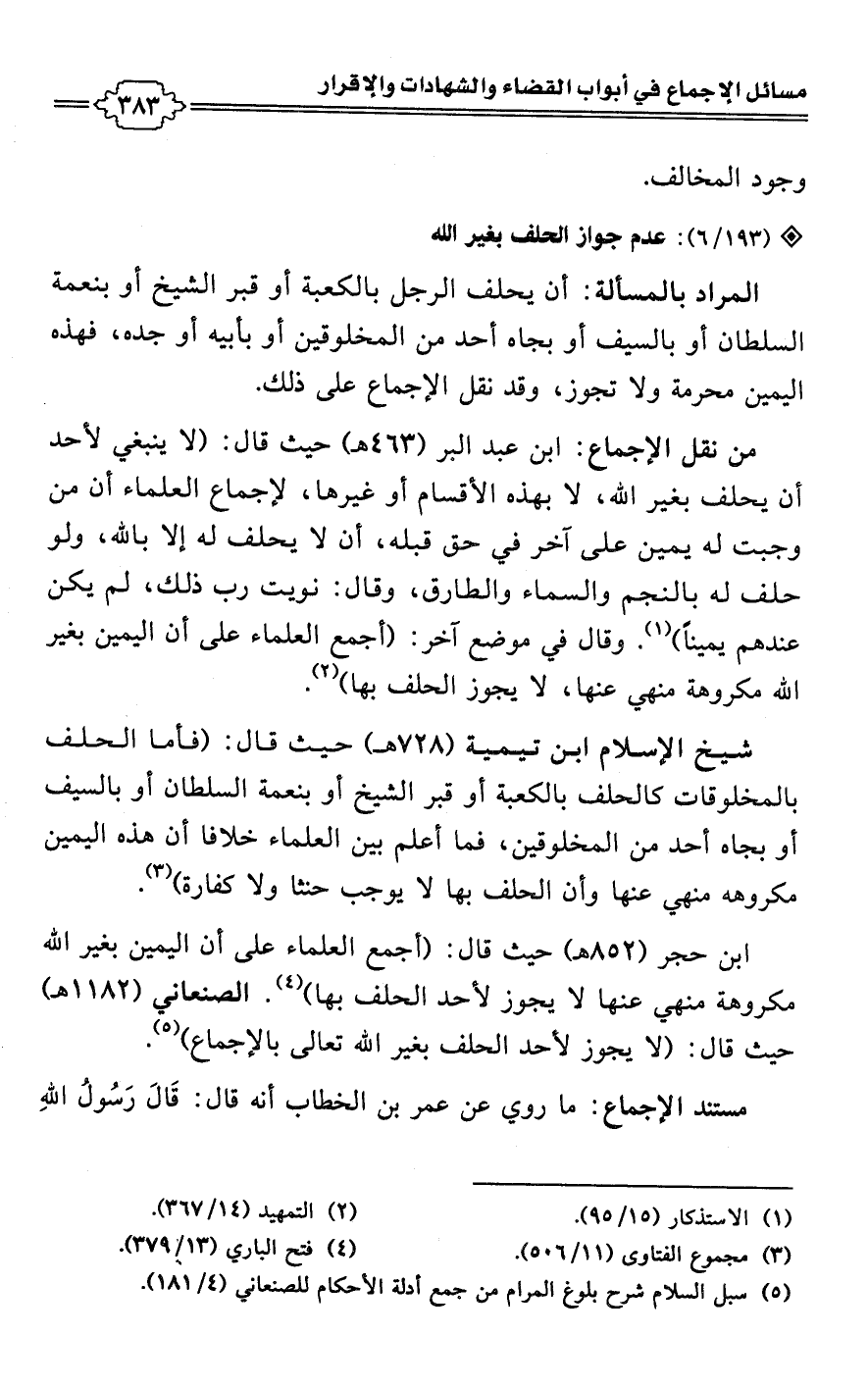 ابن حجر (852 هـ) حيث قال: (أجمع العلماء على أن اليمين بغير اللَّه مكروهة منهي عنها لا يجوز لأحد الحلف بها) (¬4). الصنعاني (1182 هـ) حيث قال: (لا يجوز لأحد الحلف بغير اللَّه تعالى بالإجماع) (¬5).