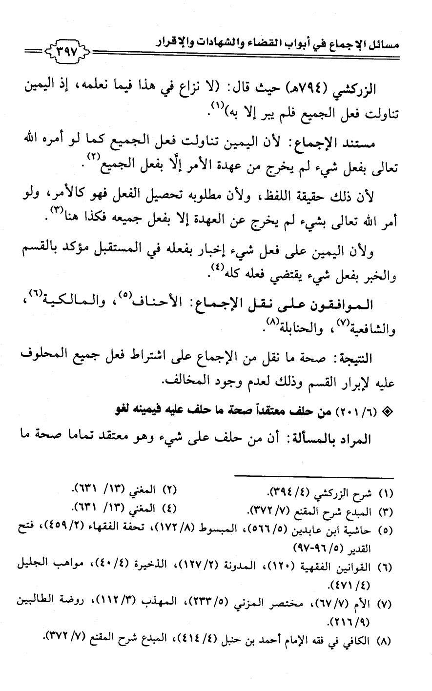الزركشي (794 هـ) حيث قال: (لا نزاع في هذا فيما نعلمه، إذ اليمين تناولت فعل الجميع فلم يبر إلا به) (¬1).