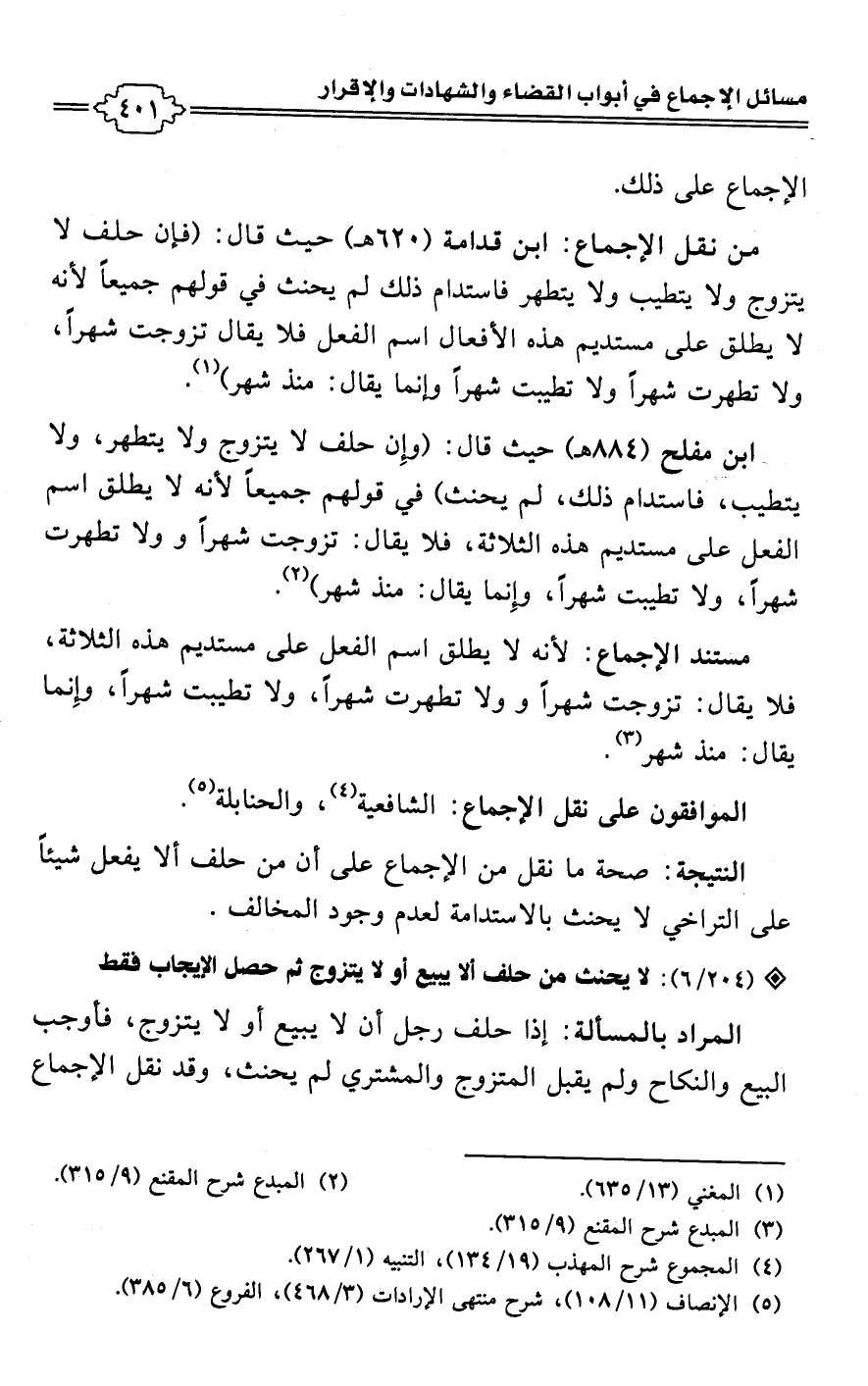 • من نقل الإجماع: ابن قدامة (620 هـ) حيث قال: (فإن حلف لا يتزوج ولا يتطيب ولا يتطهر فاستدام ذلك لم يحنث في قولهم جميعًا لأنه لا يطلق على مستديم هذه الأفعال اسم الفعل فلا يقال تزوجت شهرًا، ولا تطهرت شهرًا ولا تطيبت شهرًا وإنما يقال: منذ شهر) (¬1).