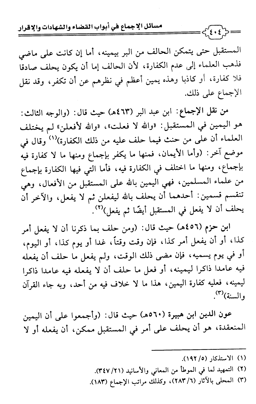 • من نقل الإجماع: ابن عبد البر (463 هـ) حيث قال: (والوجه الثالث: هو اليمين في المستقبل: "واللَّه لا فعلت"، "واللَّه لأفعلن" لم يختلف العلماء أن على من حنث فيما حلف عليه من ذلك الكفارة) (¬1) وقال في موضع آخر: (وأما الأيمان، فمنها ما يكفر بإجماع ومنها ما لا كفارة فيه بإجماع، ومنها ما اختلف في الكفارة فيه، فأما التي فيها الكفارة بإجماع من علماء المسلمين، فهي اليمين باللَّه على المستقبل من الأفعال، وهي تنقسم قسمين: أحدهما أن يحلف باللَّه ليفعلن ثم لا يفعل، والآخر أن يحلف أن لا يفعل في المستقبل أيضًا ثم يفعل) (¬2).