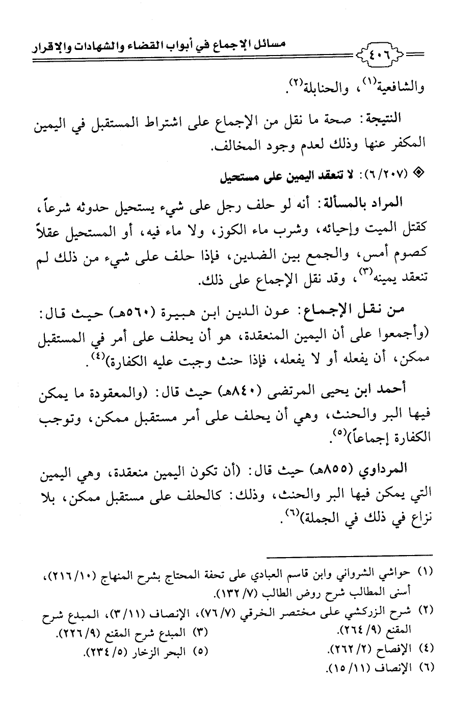 المرداوي (855 هـ) حيث قال: (أن تكون اليمين منعقدة، وهي اليمين التي يمكن فيها البر والحنث، وذلك: كالحلف على مستقبل ممكن، بلا نزاع في ذلك في الجملة) (¬6).