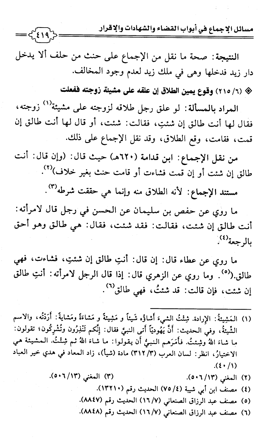 • من نقل الإجماع: ابن قدامة (620 هـ) حيث قال: (وإن قال: أنت طالق إن شئت أو إن قمت فشاءت أو قامت حنث بغير خلاف) (¬2).