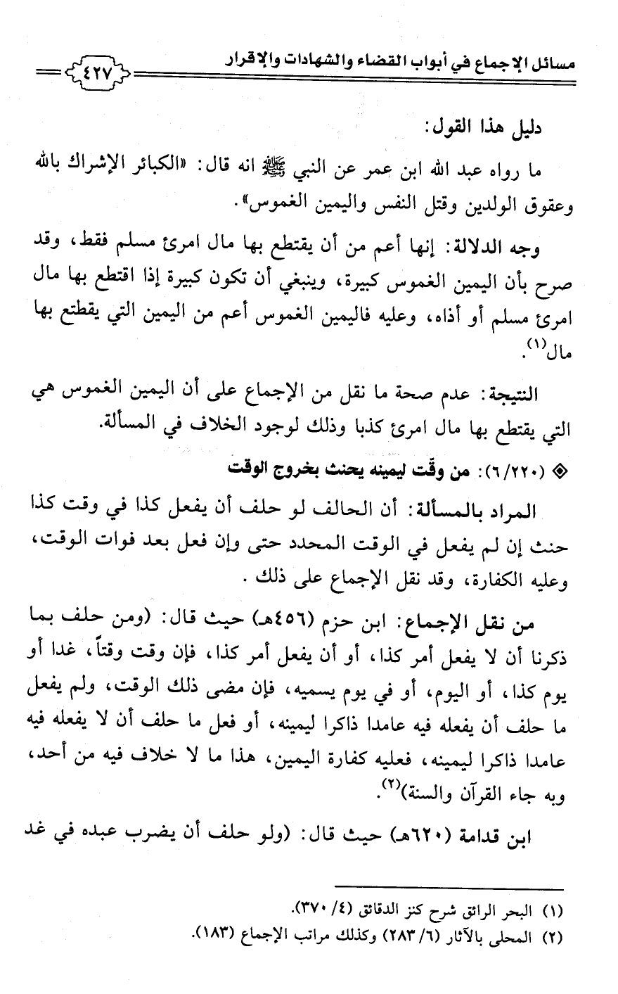 • وجه الدلالة: إنها أعم من أن يقتطع بها مال امرئ مسلم فقط، وقد صرح بأن اليمين الغموس كبيرة، وينبغي أن تكون كبيرة إذا اقتطع بها مال امرئ مسلم أو أذاه، وعليه فاليمين الغموس أعم من اليمين التي يقطتع بها مال (¬1).Rعدم صحة ما نقل من الإجماع على أن اليمين الغموس هي التي يقتطع بها مال امرئ كذبا وذلك لوجود الخلاف في المسألة.