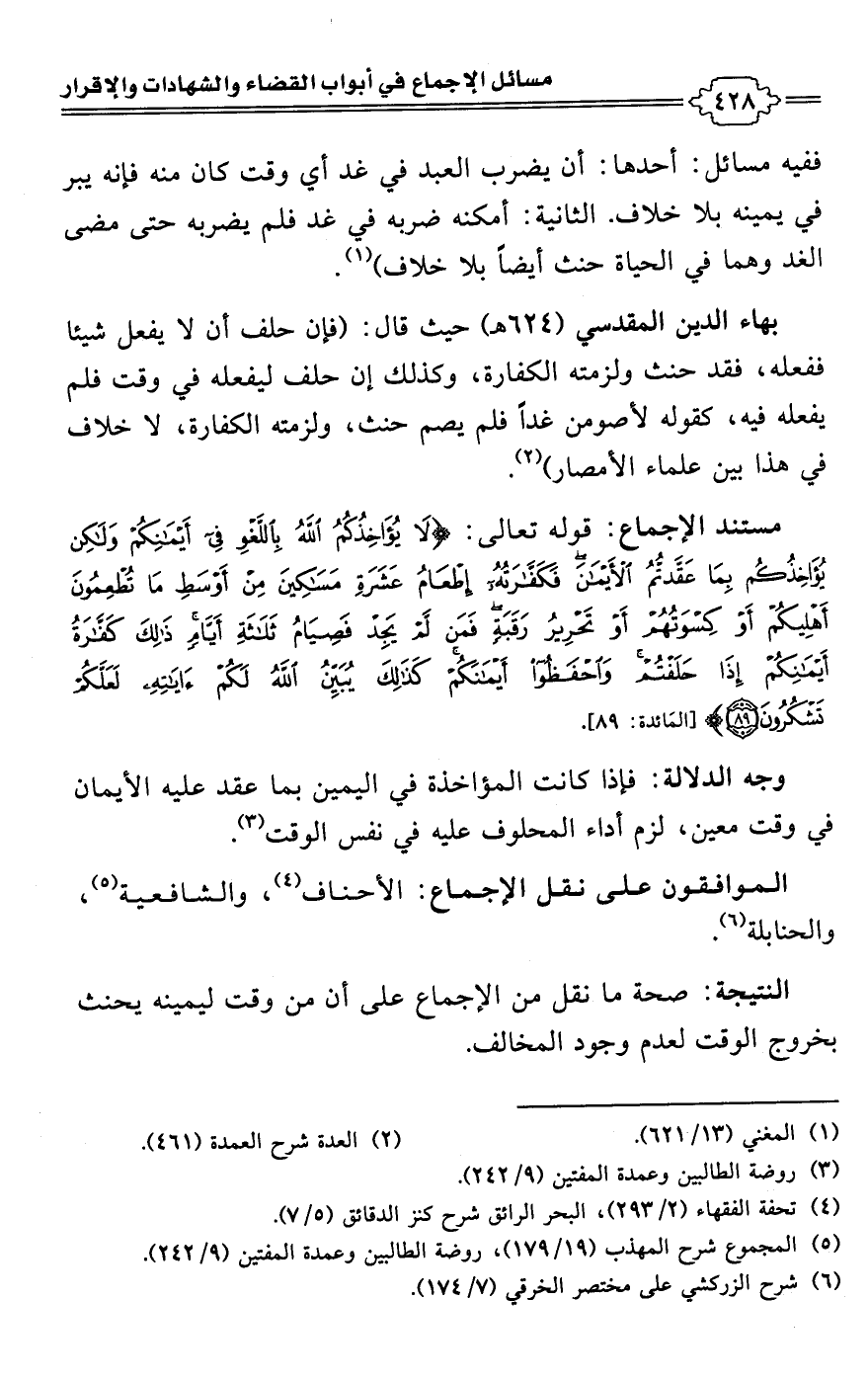 بهاء الدين المقدسي (624 هـ) حيث قال: (فان حلف أن لا يفعل شيئًا ففعله، فقد حنث ولزمته الكفارة، وكذلك إن حلف ليفعله في وقت فلم يفعله فيه، كقوله لأصومن غدًا فلم يصم حنث، ولزمته الكفارة، لا خلاف في هذا بين علماء الأمصار) (¬2).
