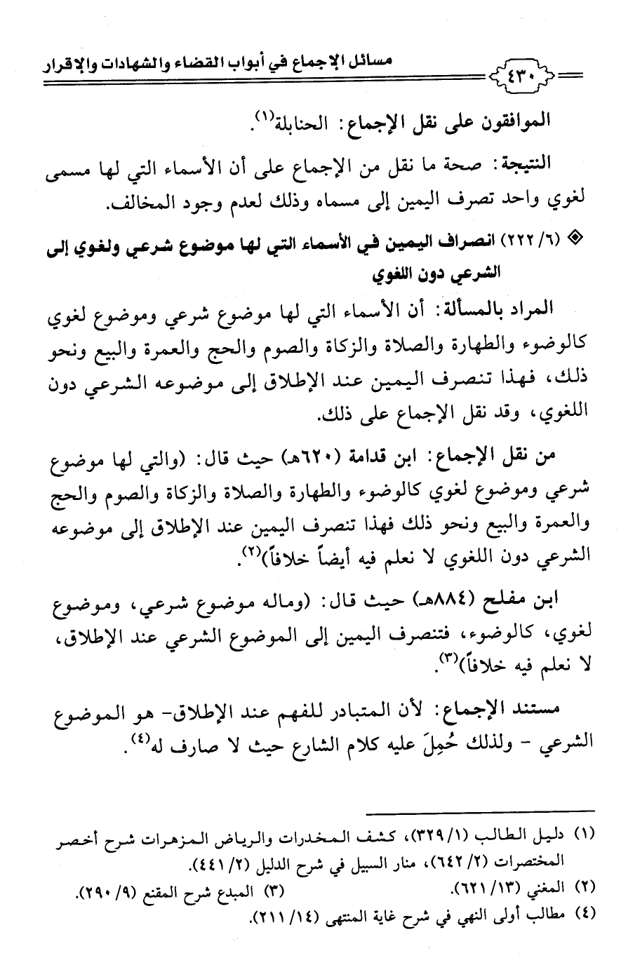 • من نقل الإجماع: ابن قدامة (620 هـ) حيث قال: (والتي لها موضوع شرعي وموضوع لغوي كالوضوء والطهارة والصلاة والزكاة والصوم والحج والعمرة والبيع ونحو ذلك فهذا تنصرف اليمين عند الإطلاق إلى موضوعه الشرعي دون اللغوي لا نعلم فيه أيضًا خلافًا) (¬2).